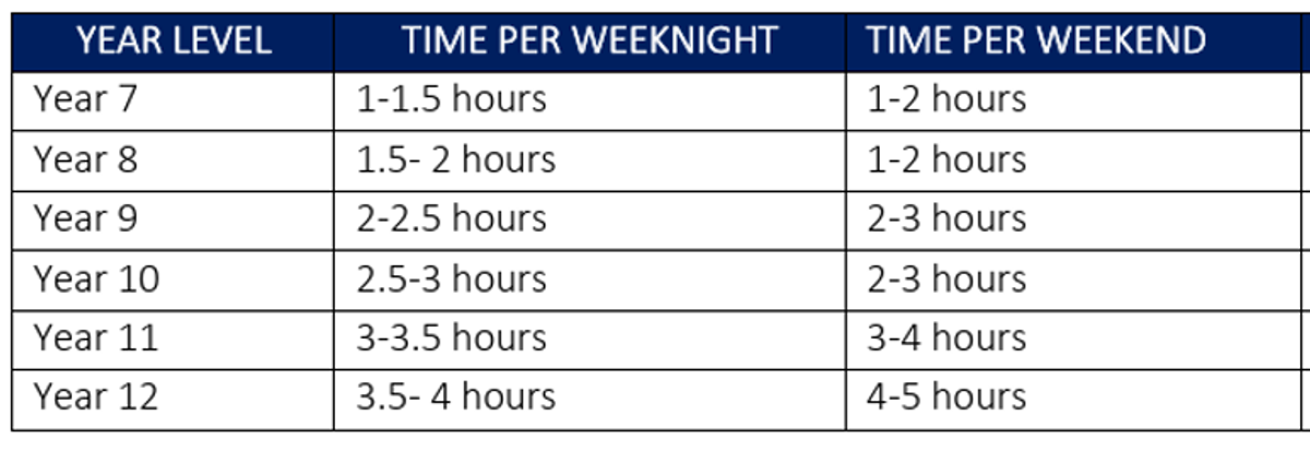 Below are the suggested homework and revision times for both weekdays and weekends to help students plan their study effectively.