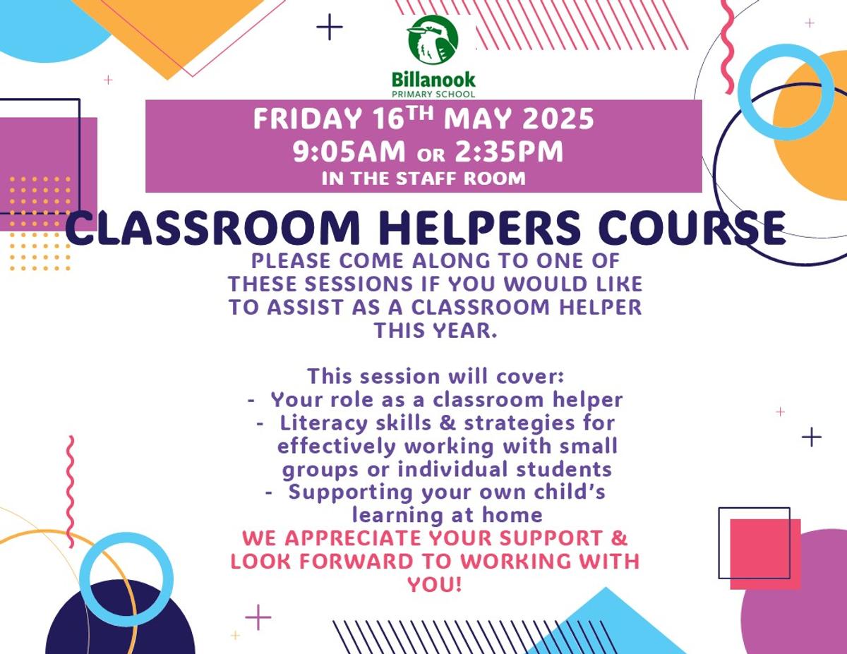 If you would like to assist in your child's classroom in 2025, even if you have done this course in the past, please come along to one of the Classroom Helpers sessions on Friday 16th May at 9.05am OR 2:35pm. These sessions will be held in the Staff Room and we ask that you sign in at the Office on arrival.