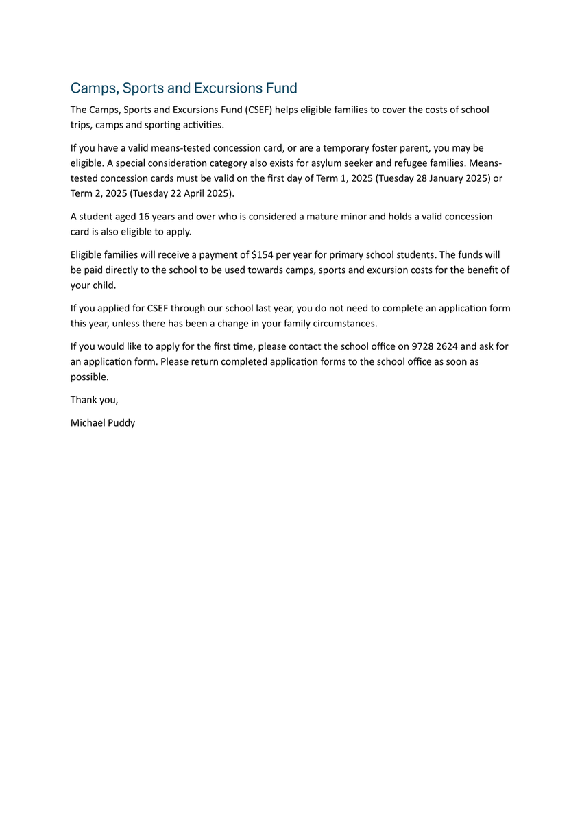 For more information, see: Camps, Sports and Excursions Fund (CSEF): Eligibility | education.vic.gov.au