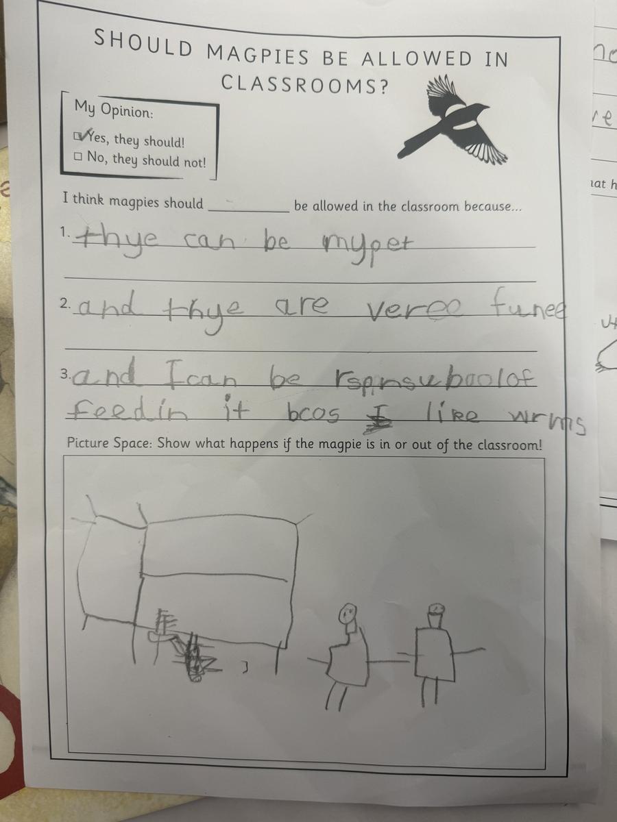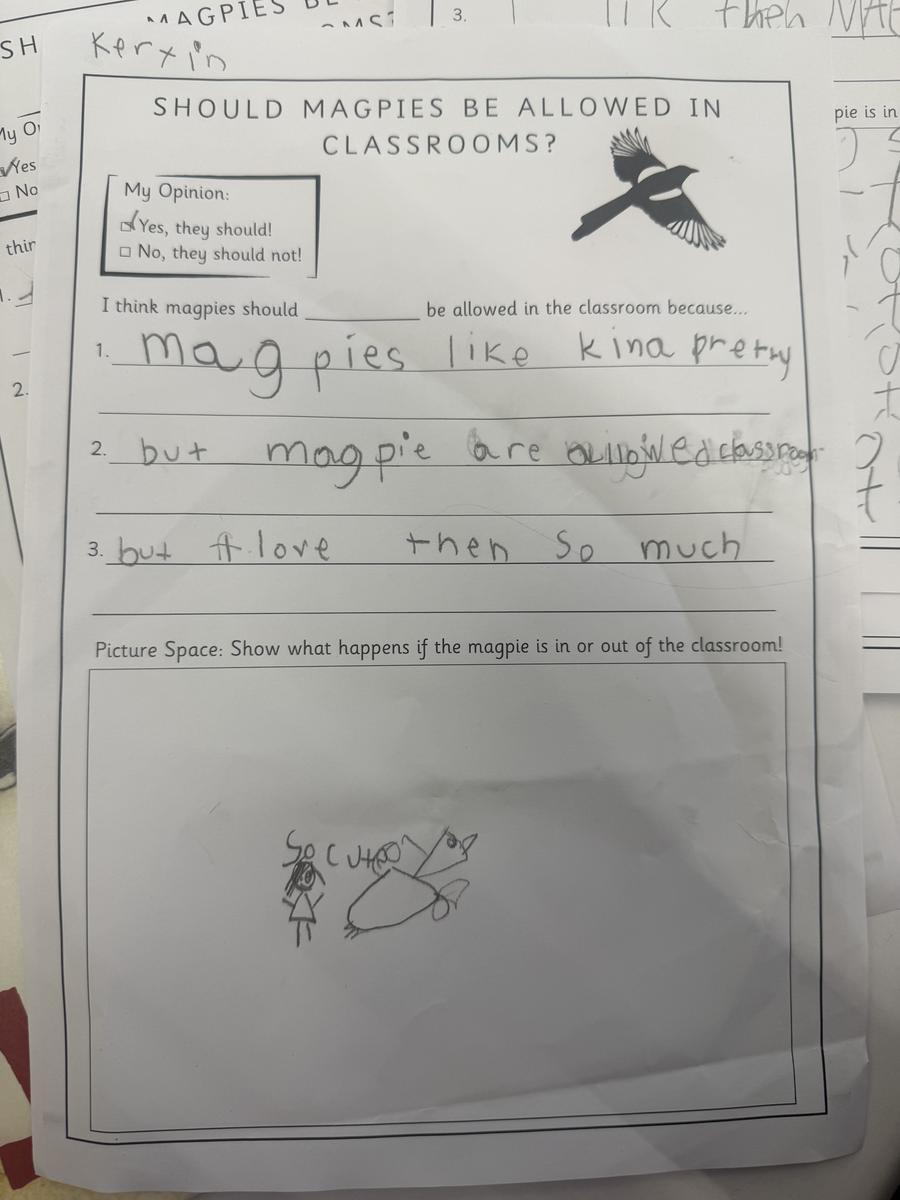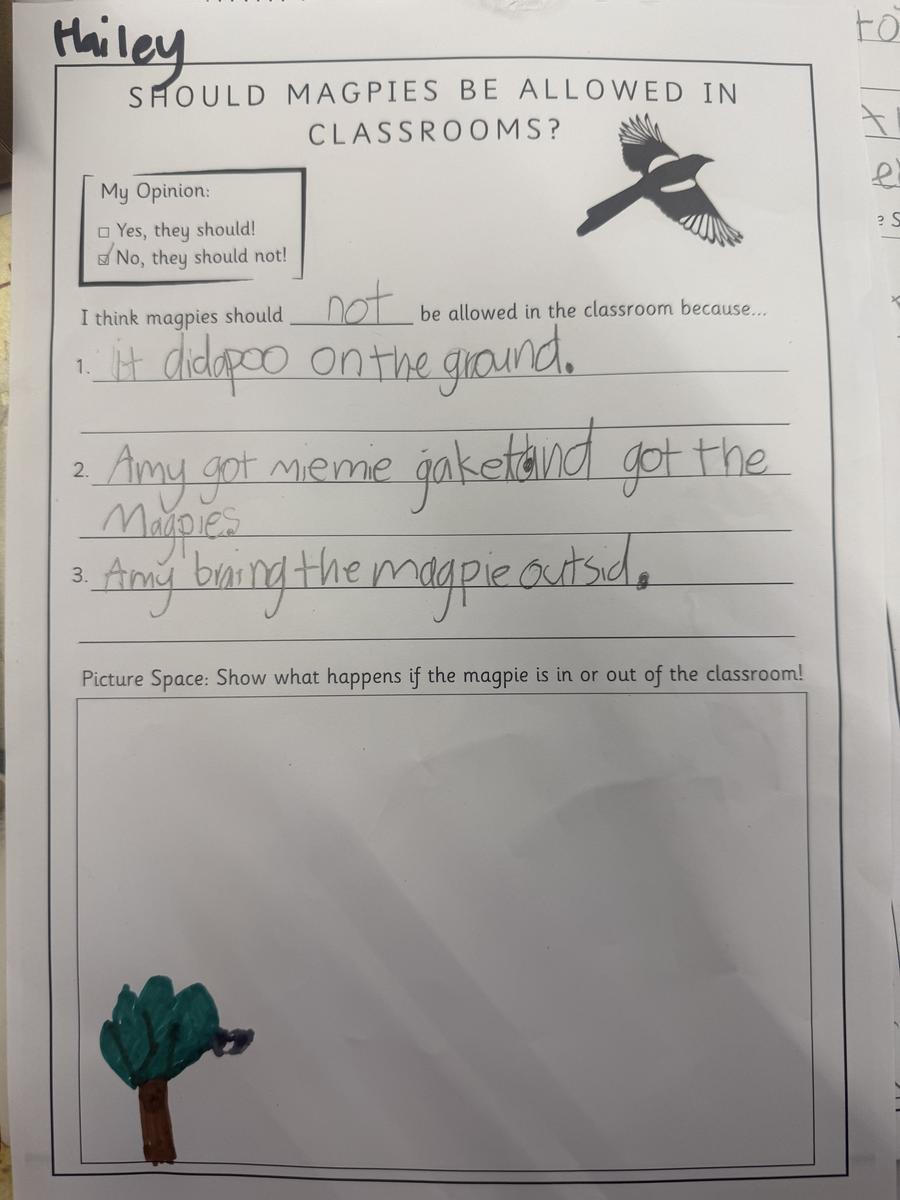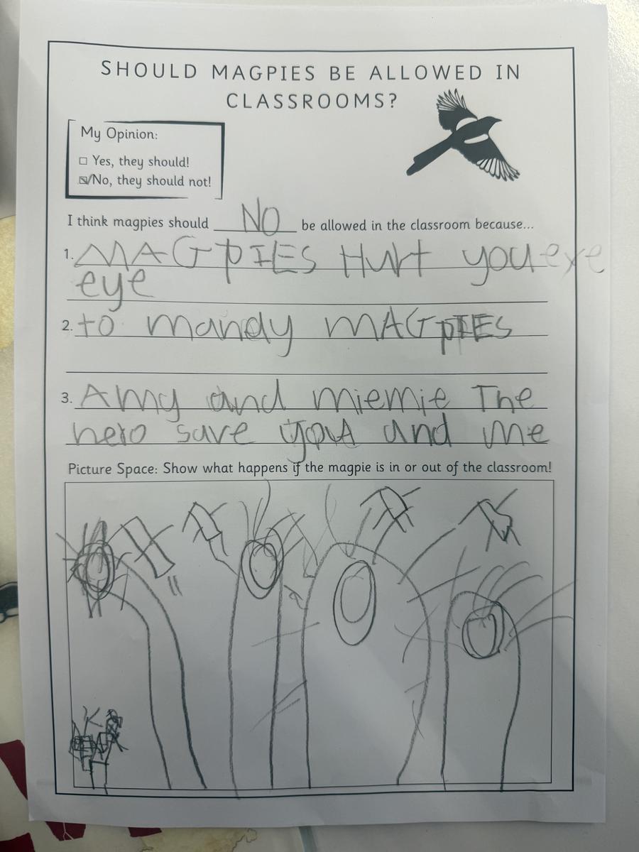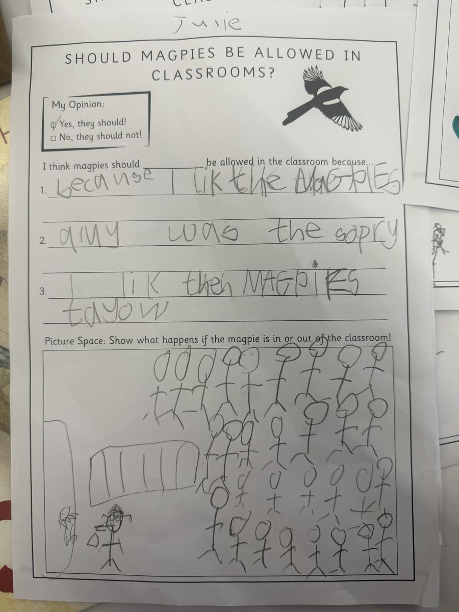 We later discovered, thanks to Zac H from Year 6, that the magpie was a female, as she had grey on her back. The students turned this wild event into a persuasive writing challenge, and we were so proud of their creativity and confidence—it was their first ever persuasive piece!
