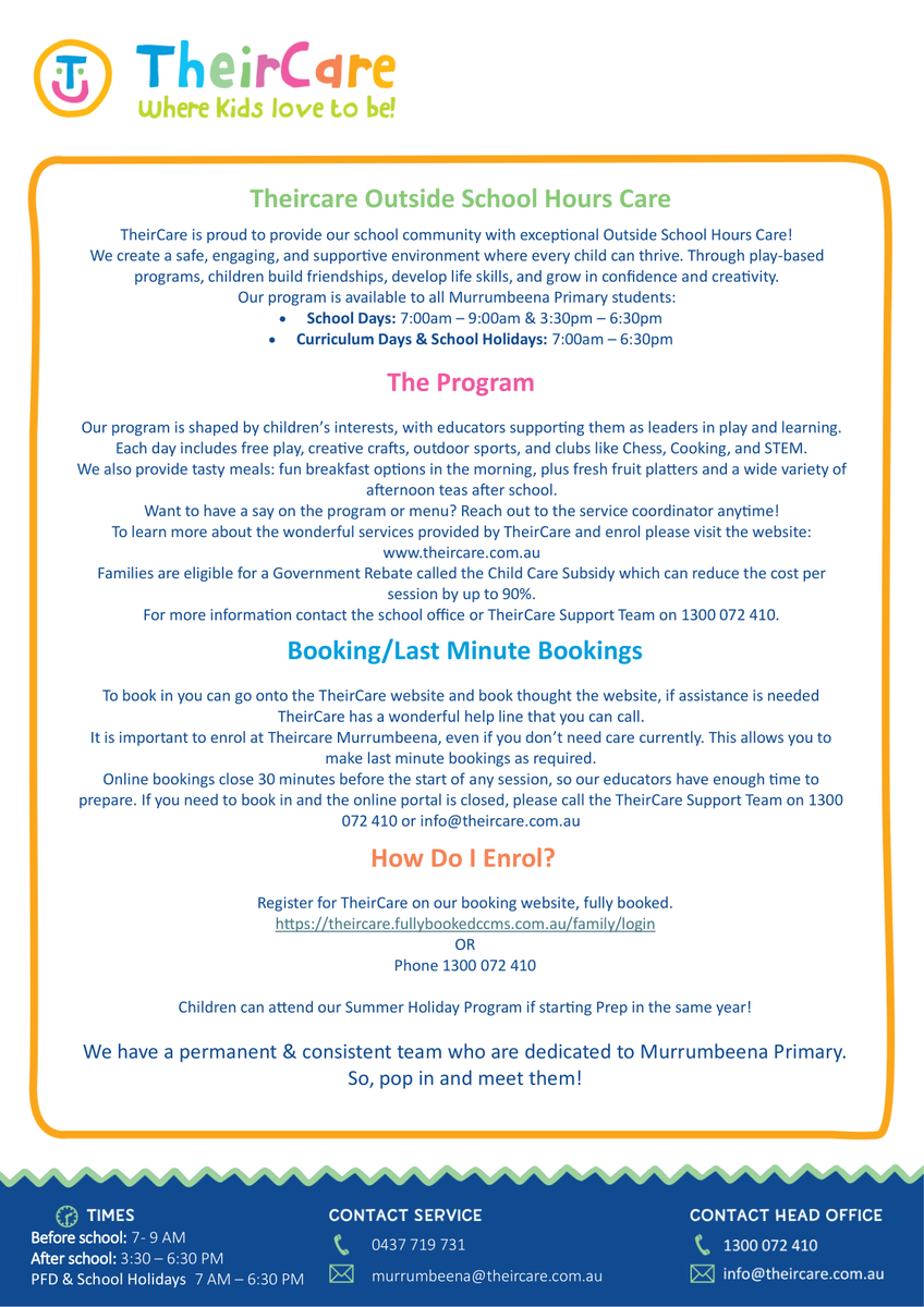 Consider booking your child into our after school care program! TheirCare offers a fun and engaging environment where students enjoy a variety of activities each afternoon.