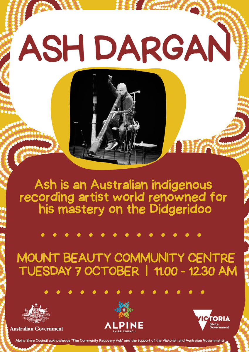 In the first week back, all students will have the opportunity to participate in a free performance with renowned First Nations recording artist, Ash Dargan. Students will attend the performance at the Mount Beauty Community Centre on Tuesday 7th October from 11am -12.30pm
