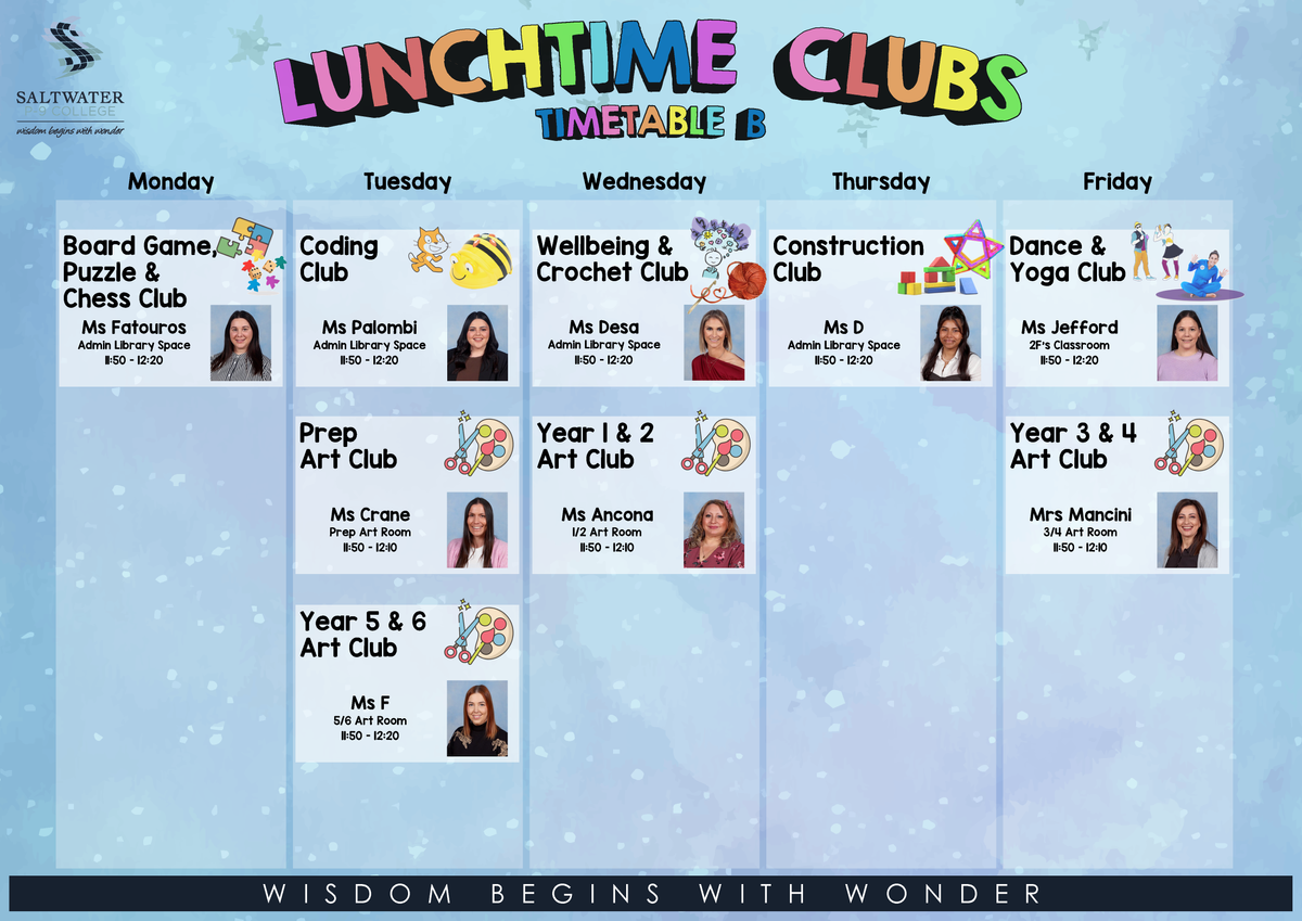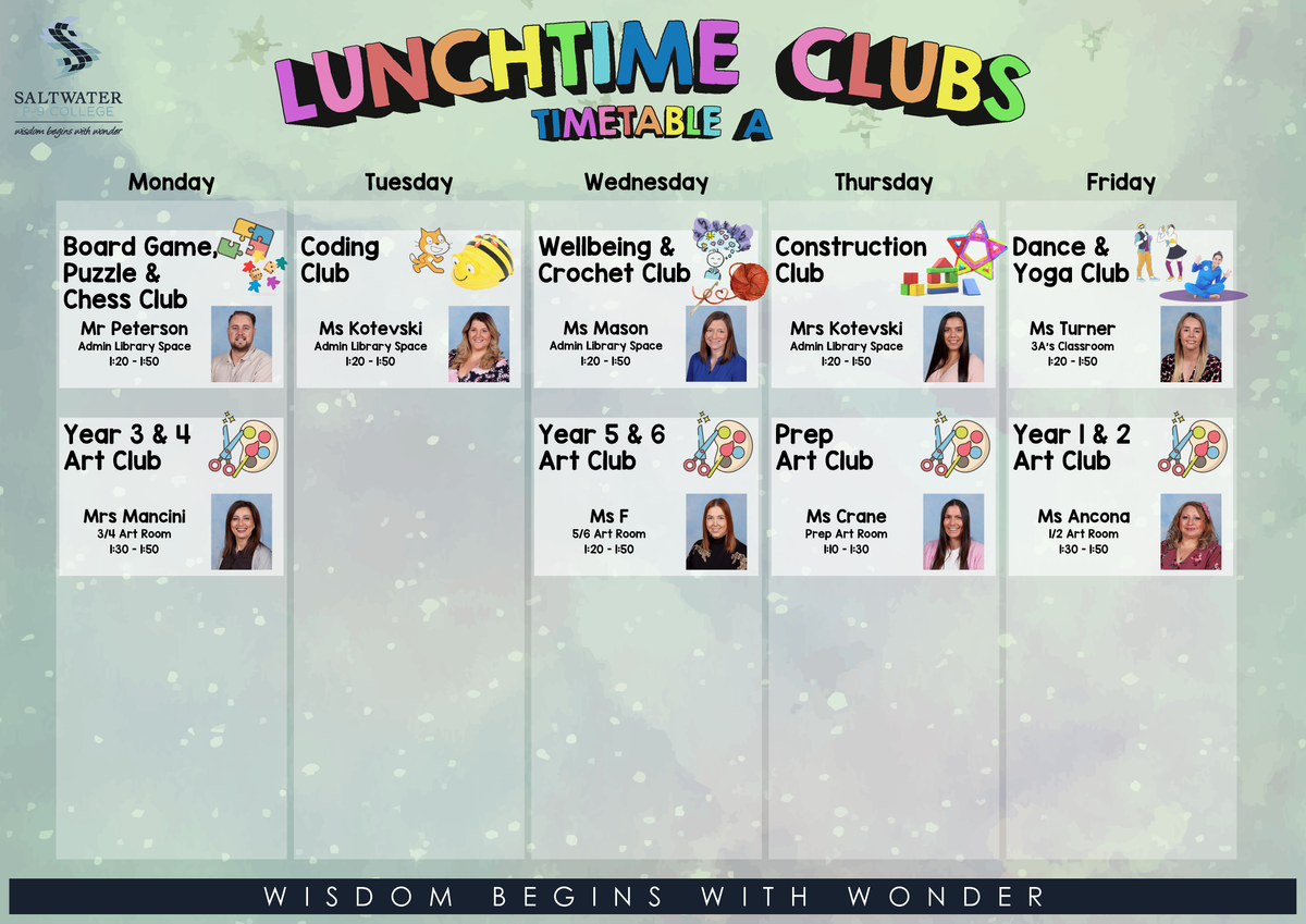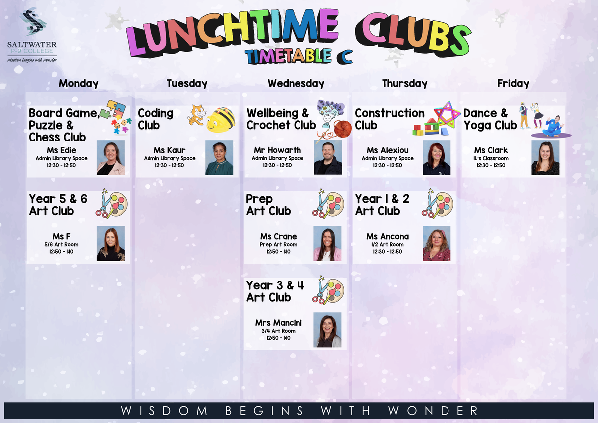 At Saltwater College, we’re proud to offer a range of lunchtime clubs designed to support student interests, wellbeing, and engagement across the week. These clubs provide students with the opportunity to connect with their peers, explore new skills, and enjoy positive social experiences in a supportive environment.