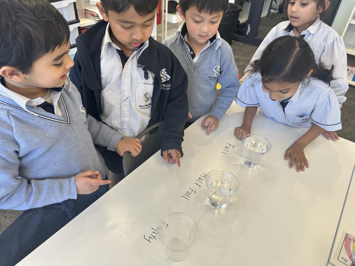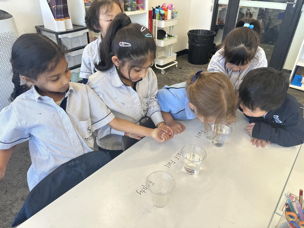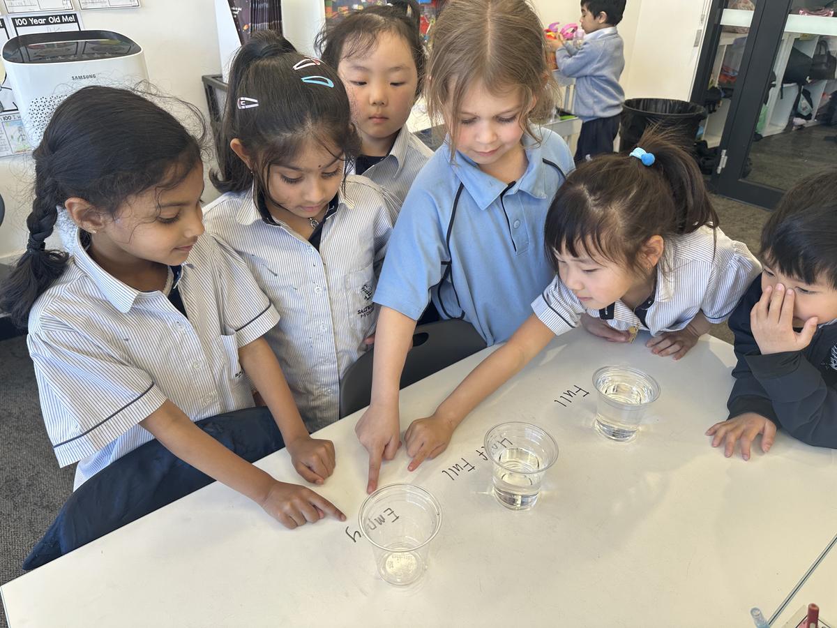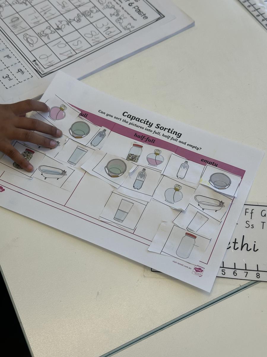 In Maths, our focus has been on mass and capacity, as well as exploring 2D shapes. Students have been using hefting to compare the weight of objects, ordering them from lightest to heaviest. They learned to use vocabulary such as heavy, light, empty, almost empty, half full, almost full, and full. We’ve also been comparing containers by filling them with different amounts of blocks, then ordering them from least capacity to most capacity. Students recorded their findings by drawing and labelling their results. In our geometry lessons, we explored 2D shapes, describing their sides and corners, and noticing whether the sides are straight or curved. Students enjoyed hunting for shapes around the classroom and sorting them into different categories.