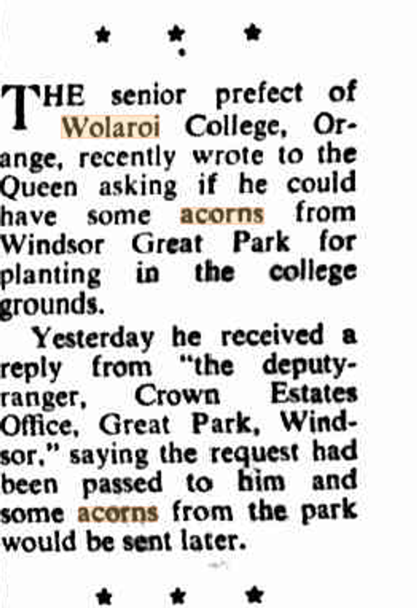 Wolaroi College heartily celebrated the coronation of Queen Elizabeth II in 1953 with a parade, church service, bonfire, fireworks and special Coronation Supper. The idea arose to plant trees as a visual reminder of the event, so the Senior Prefect of Wolaroi College boldly wrote to the new Queen, seeking to be sent some oaks from the Royal estate in Windsor.