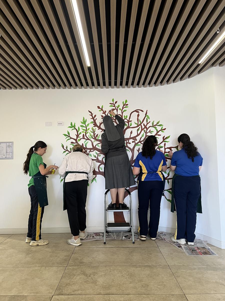 I want to extend heartfelt thanks to the wonderful staff at OLMP for trusting us to bring this vision to life. Special appreciation goes to the Year 10 volunteers Danielle, Daniella, and Grace, whose enthusiasm and hard work were invaluable in painting the mural, as well as to Mrs. Hani and Sister Juliette for their artistic support throughout the project.