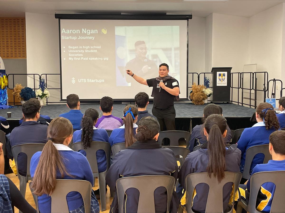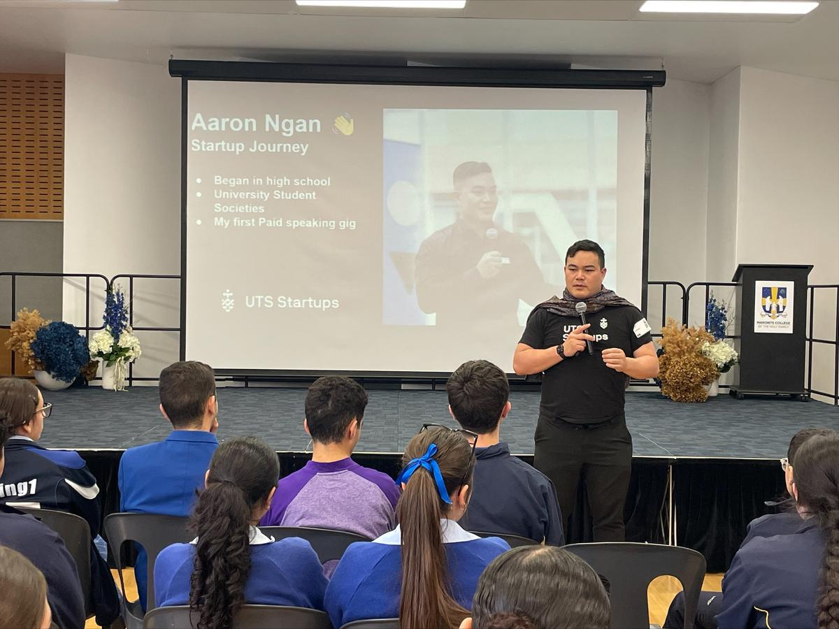 Since 2022, Aaron Ngyan has been visiting Maronite College of the Holy Family (MCHF) as part of the Engage and Enrichment Showcase. In his most recent session, hosted by UTS Startups, Aaron shared his journey as an entrepreneur and innovator. He spoke about the power of AI, the importance of hard work and resilience, and the value of starting early to bring ideas to life.