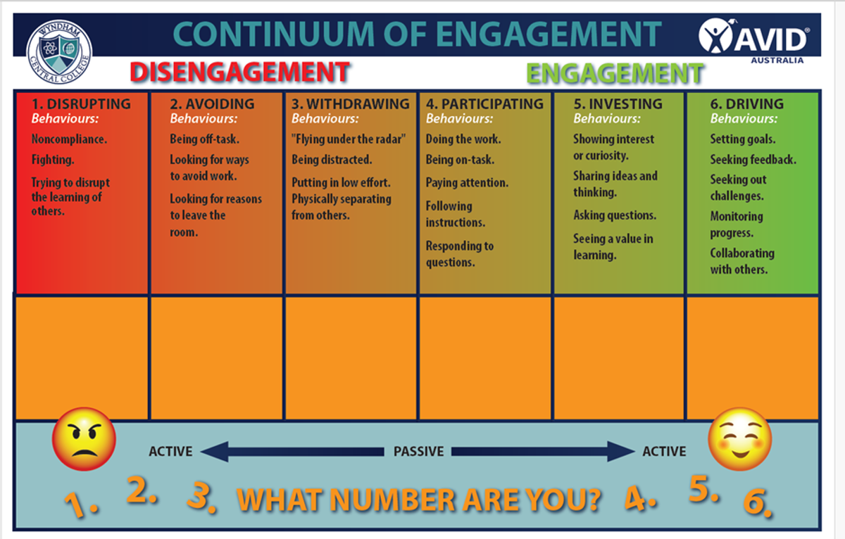 At Wyndham Central College, we are committed to ensuring all students have the tools they need to succeed. This year, we have explicitly taught the Amy Berry Engagement Continuum to help students understand the behaviours that drive positive learning outcomes. The model introduces students to key language and strategies that enable them to identify their own levels of engagement and take steps to improve their focus and participation. By embedding this framework into our daily practices, we aim to empower students to take greater ownership of their learning, boosting both their engagement and overall academic performance.
