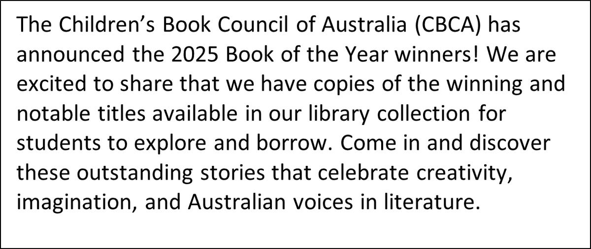 If you have good quality fiction and non- fiction titles that you no longer need, we would love to hear from you. Please email Lindell.saunders@education.vic.gov.au with a list of titles you wish to donate so that we can ensure they are the right fit for our students.