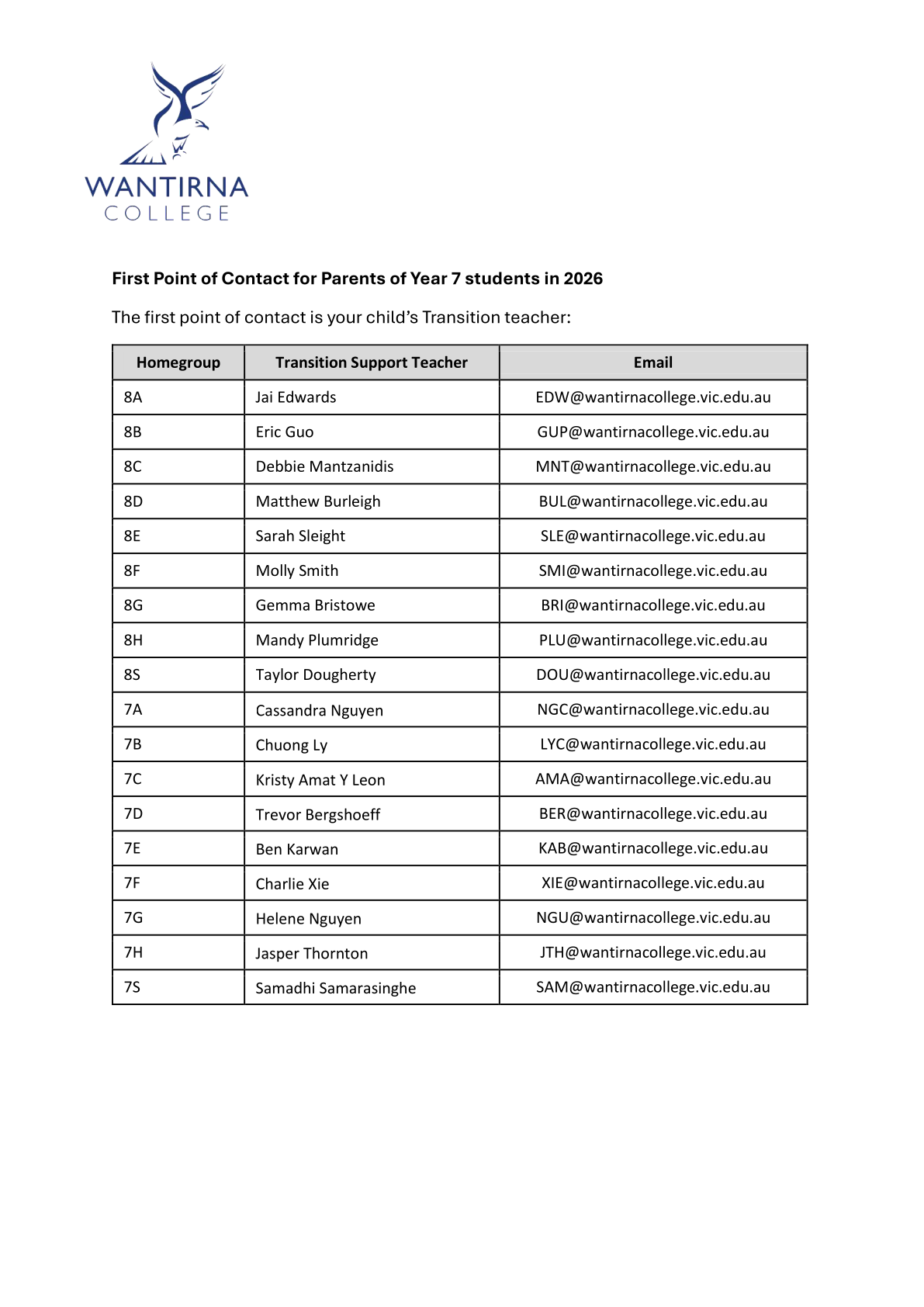 Your first point of contact should be your child’s Transition Support Teacher. This staff member teaches your child for three periods a week and will develop a strong, positive relationship with your child. The Transition Support Teacher is you and your child’s ‘go to’ person for support. Their contact details will be available at the beginning of the school year.