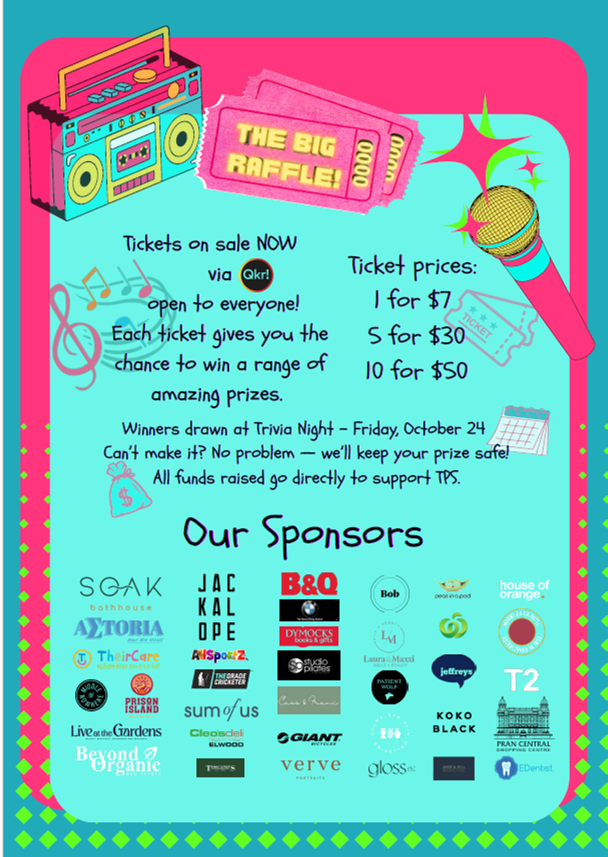 The TPS Trivia night is on the 24th October and with 90% of tickets already sold it’s gearing up to be an amazing night! Did you also know there are also HUGE prizes in the TPS Big Raffle up for grabs? You don’t need to attend the event to win, but you do need to buy raffle tickets to be in with a chance! Click here to check out the prizes up for grabs. There are 11 major prizes from our amazing sponsors with a combined value of over $11,000. Both the remaining tickets for the night and Trivia raffle tickets are available now on Qkr!
