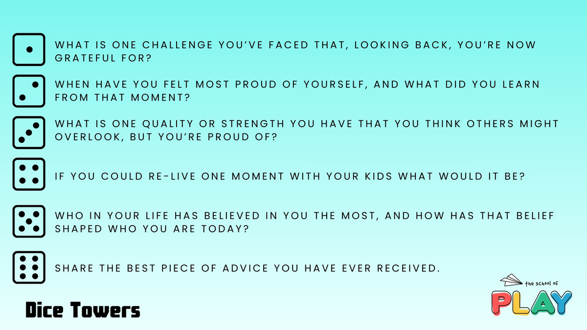 Dice Towers - can you roll your 6 dice and stack them in order 1 -6? Each round, stack as far as you can go before rolling the remaining dice. Before you roll, answer a question that correlates to the top dice. First to stack all 6 wins.