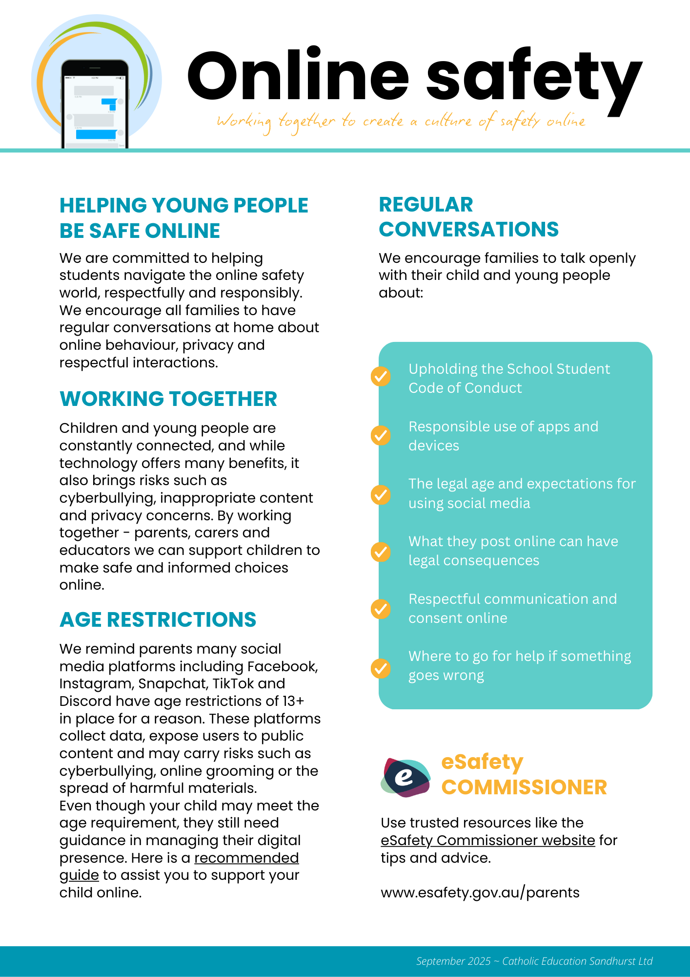 Launching a regular series for parents, this first flyer below helps families start regular chats about respectful online behaviour, privacy, app age restrictions and where to find trusted advice from the eSafety Commissioner.