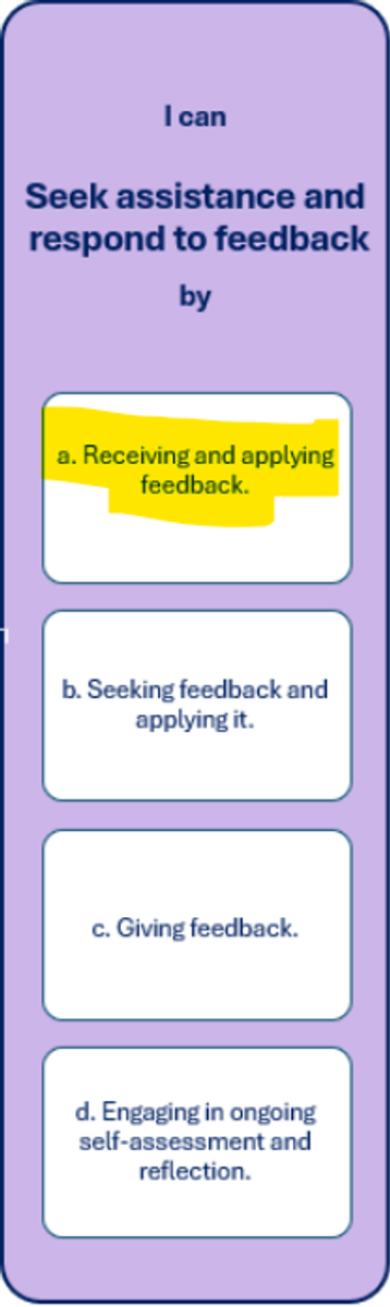 These behaviours support you to become better at obtaining, providing and using feedback. Feedback is always about the task not the person. Beyond school, this means that you`ll be able to apply, and provide, constructive feedback that will lead to better outcomes. These behaviours are assessed on a scale from Trainee (Step 1) to Practitioner (Step 4).