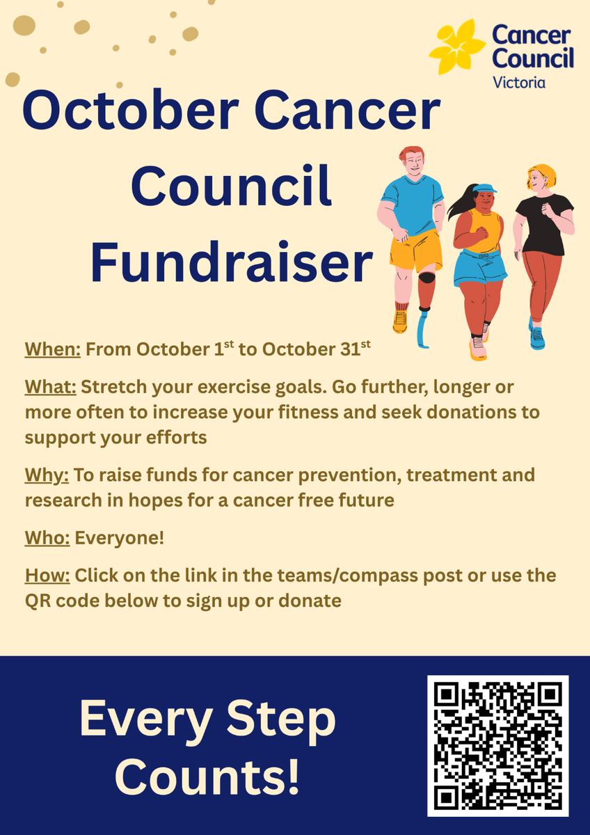 For the entire month of October, Viewbank College is hosting a fundraiser for Cancer Council. Our aim is to raise $4000 for cancer research, treatment and prevention in Australia. You can make a difference by committing to a certain amount of exercise (time, distance or number of sessions) across a week or the month that extends beyond your normal activity, and by seeking donations from friends and family to support you. Any exercise counts, whether it’s running, swimming, walking or playing a sport, and it doesn’t have to be long, just more than you currently do.