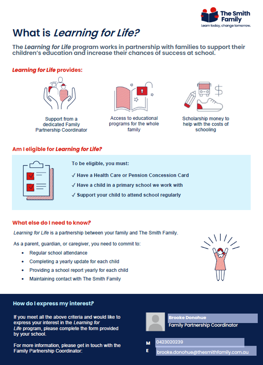 The Learning for Life program is a partnership between your family and The Smith Family to support their children’s education and increase their chances of success at school.