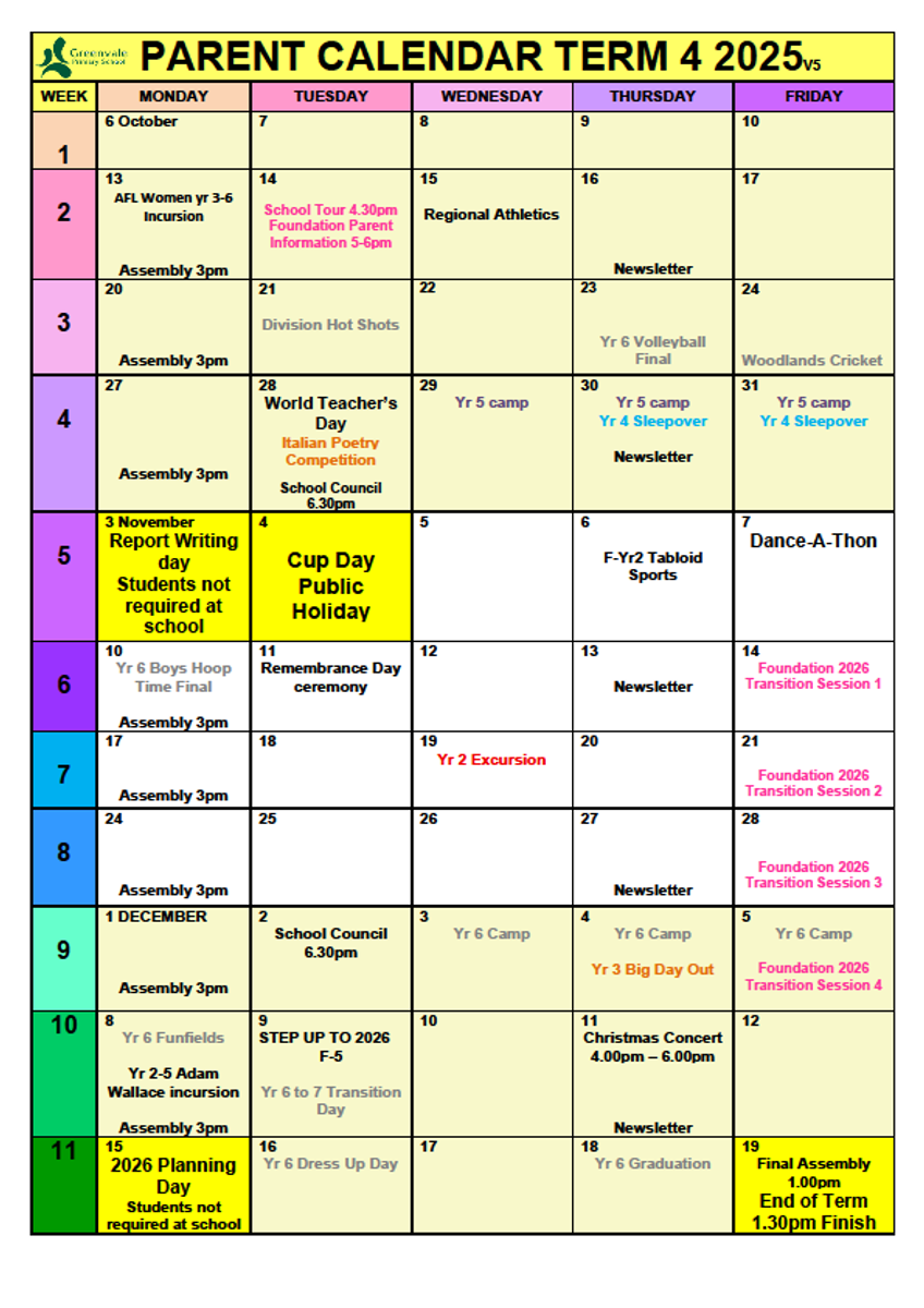 Term 4 Calendar