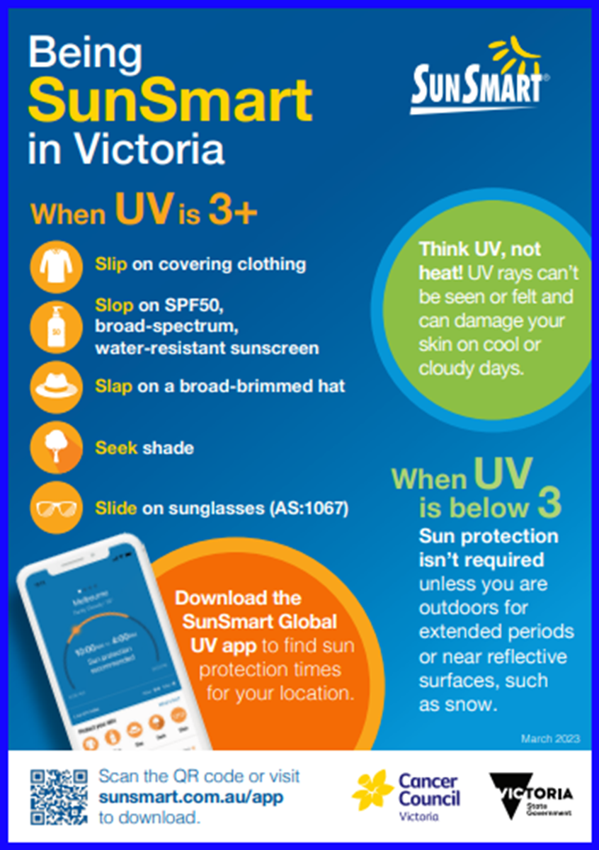 For Parents and Carers: Download the freeSunSmart Global UV app that puts sun protection advice from the Cancer Council Victoria for your current location, at your fingertips.