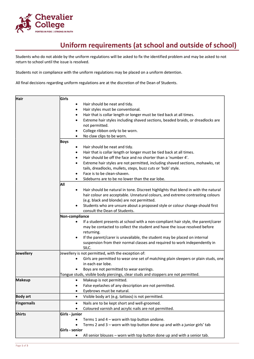 Students who do not meet the uniform expectations will be required to address the issue promptly and may be asked to remain at home until the matter is resolved. Final decisions regarding uniform compliance rests with the Dean of Students.