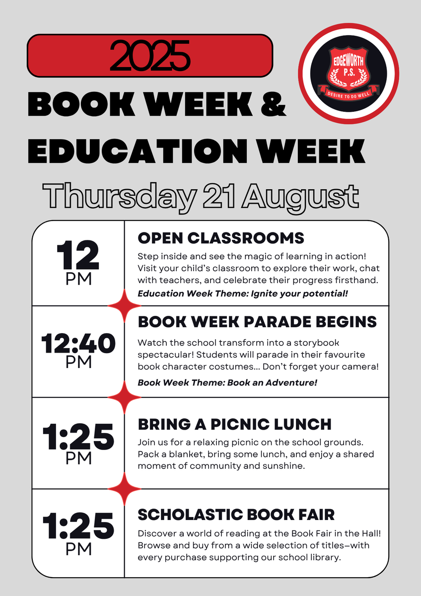 We’re also excited for Book Week, which we’ll be celebrating along with Education Week in Week 5. 🎓✨ Our beloved Book Week Parade will take place at 12:40pm on Thursday 21 August. Students are encouraged to dress up as their favourite book characters, and families are warmly invited to join us for the fun. 👗🧙♂️🦸♀️