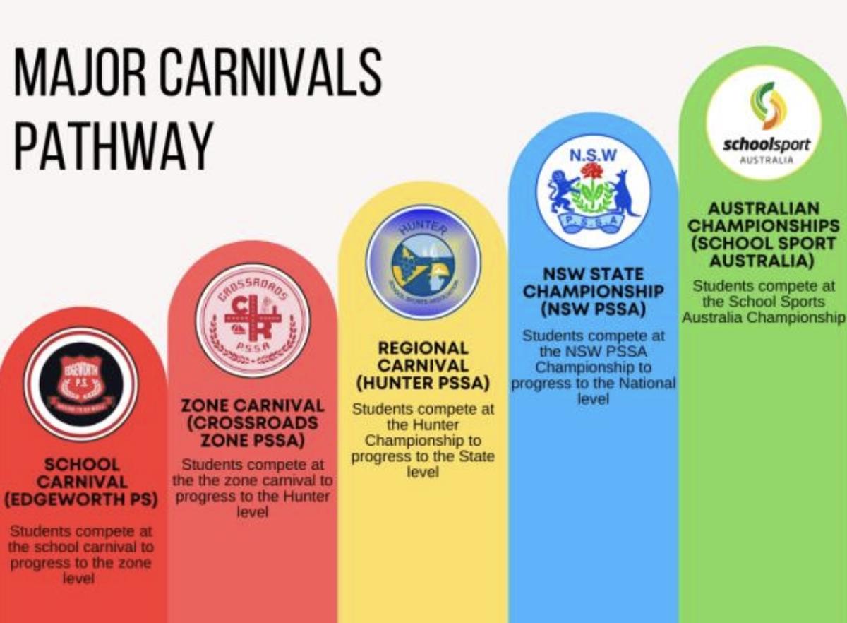 At Edgeworth Public School, Students from Years 2-6 (8 years and older) have the opportunity to participate in the three major school carnivals: swimming, cross country and athletics held each year. These carnivals are used to select representatives that will compete against students from other schools at the Crossroads PSSA zone carnivals. Students that meet the criteria at the Zone level, then progress to the next level in the representative pathway (see below).