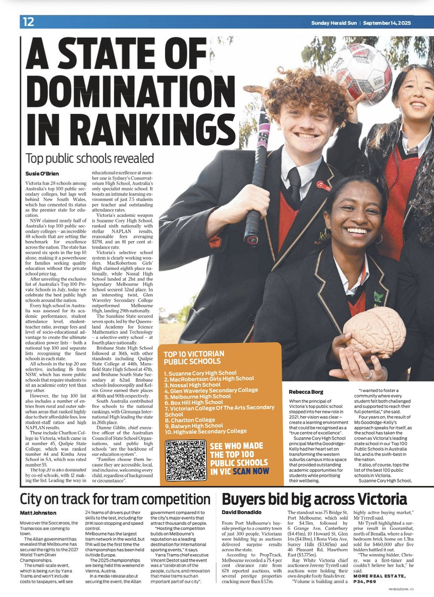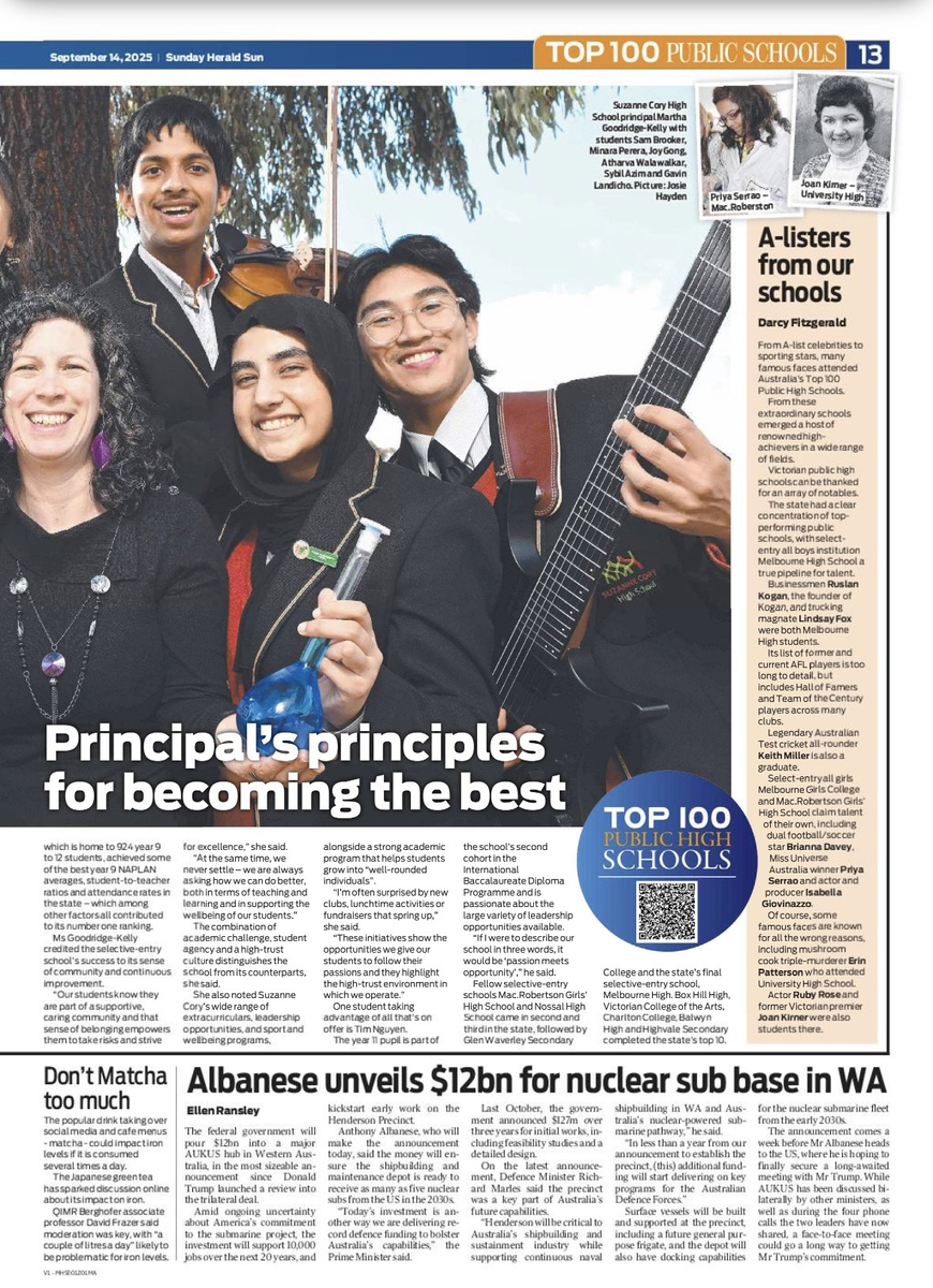 As our Principal, Ms Goodridge Kelly, highlighted in her report, Suzanne Cory High School has been recognised as the top government school in Victoria for 2025, as reported by the Herald Sun. This achievement is a testament to the hard work, talent, and commitment of our students, staff, and wider community.