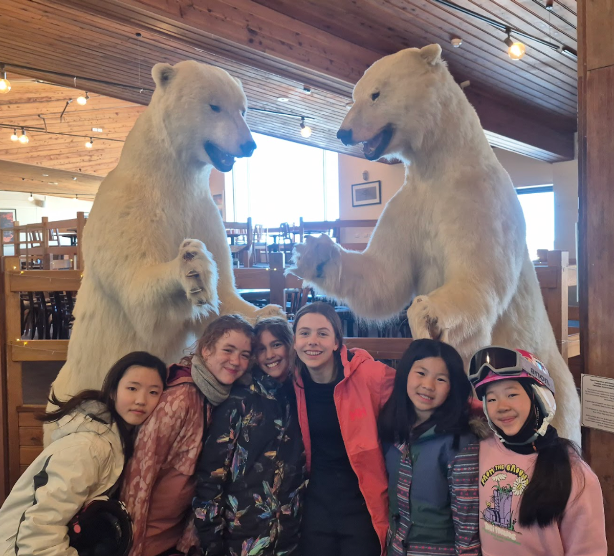 As we walked down the hall in a rush to get changed every nook and cranny was filled with bags and people struggling to get their ski clothes/equipment on. As sweat ran down our faces we finally succeeded to put our gear on. Our whole body felt scorching hot, tight but relieved at the same time. After the majority of people were changed we headed down stairs we were startled by huge chunks of snow. As people slid down the mountain of snow whilst trying to get up, others were having merciless snowball fights though some were just eating their lunch as tranquil as possible.