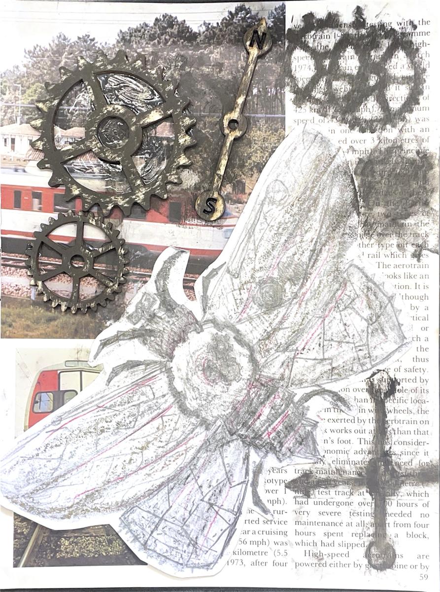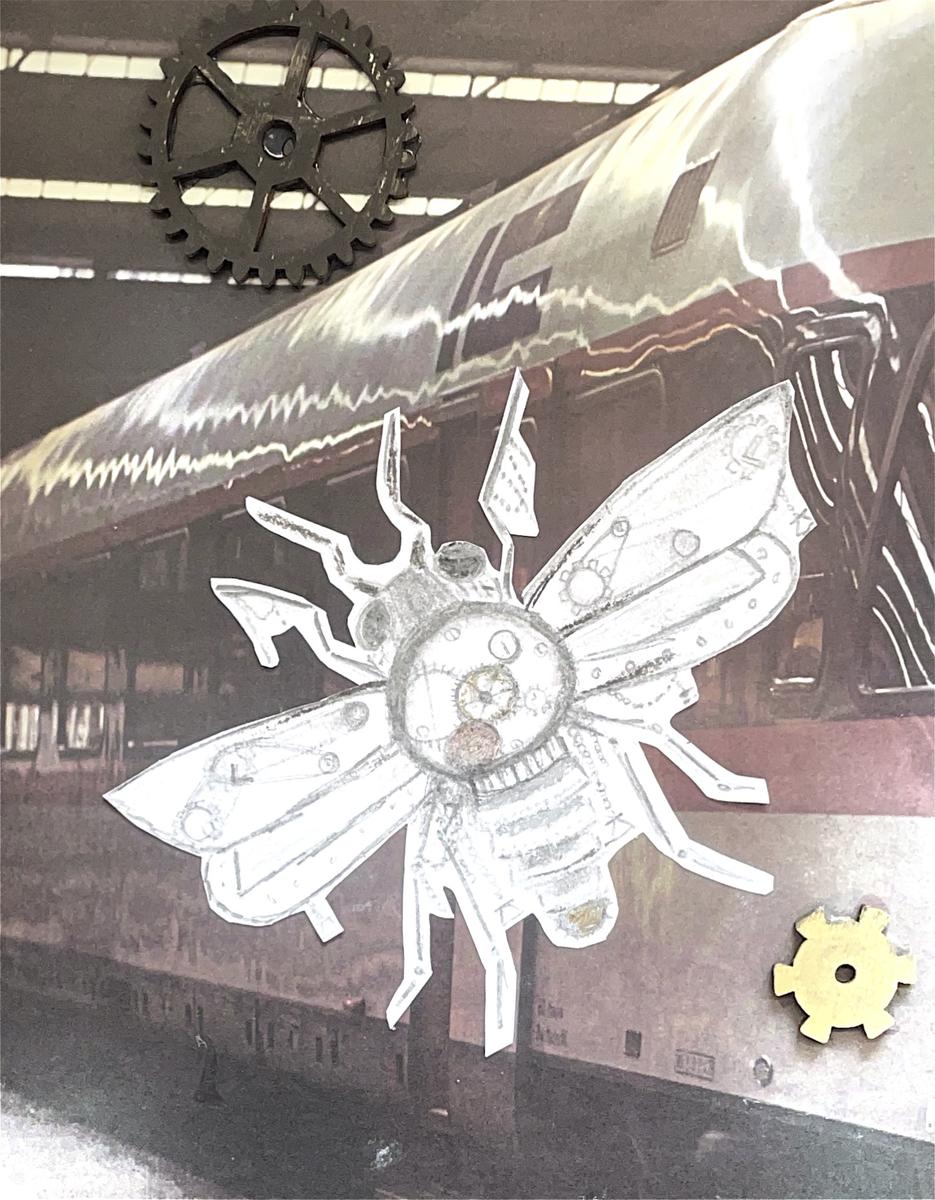 Grade 5 students have been exploring the imaginative world of theSteampunk genre in art. Inspired by the mix of history, machinery, and fantasy, students began by sketching Steampunk-inspired insects, focusing on shading and value to give their creatures depth and texture. They then brought their designs to life through collage, layering their sketches over pages from vintage books and embellishing them with wooden cogs and gears to capture the mechanical aesthetic of Steampunk design.