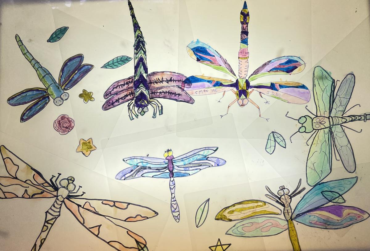 Grade 4 students have been experimenting with the reverse acetate technique using colourful textas and markers. This creative process allows students to draw on clear acetate sheets, revealing bright, luminous designs when viewed from the reverse side. For this project, students drew detailed dragonflies, focusing on colour, and symmetry to capture the beauty of these delicate insects. Their artworks will soon be transformed into hanging mobiles for the upcoming Art Show.