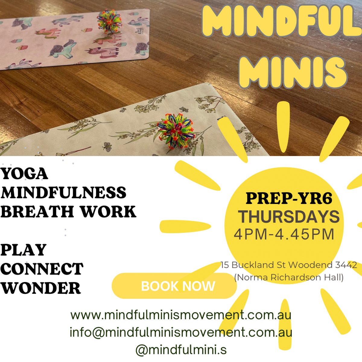 • Day: Mondays• Time: 4:00pm – 5:00pm• Venue: Macedon Ranges Sports Precinct• Address: 281 Barringo Road, New Gisborne VIC 3438