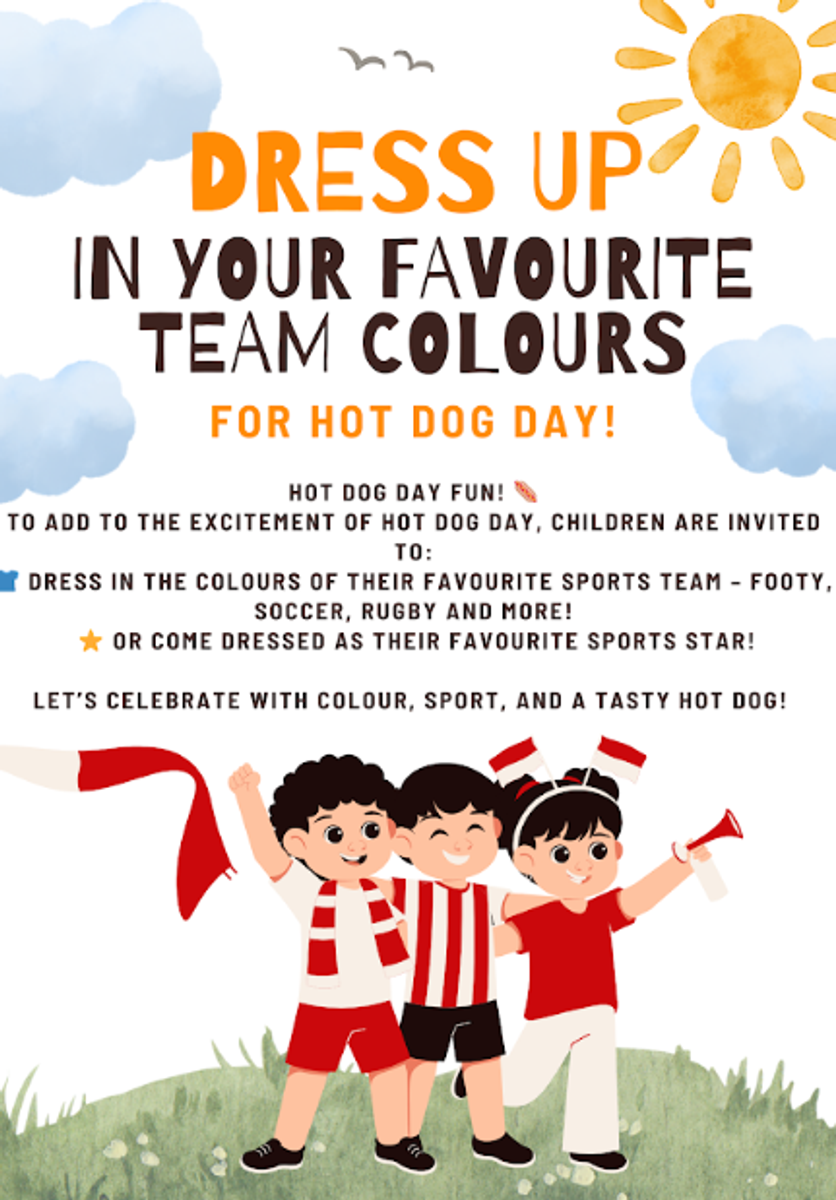 This Thursday 18th September we will be having a Special Lunch Day run by the Parents and Friends. Students who have ordered their Hot Dog and Drink last week, will receive their special lunch order during the middle session of the day. Unfortunately due to ordering deadlines we are unable to accept any late orders. A reminder that students can wear their favourite sporting colours on this day.