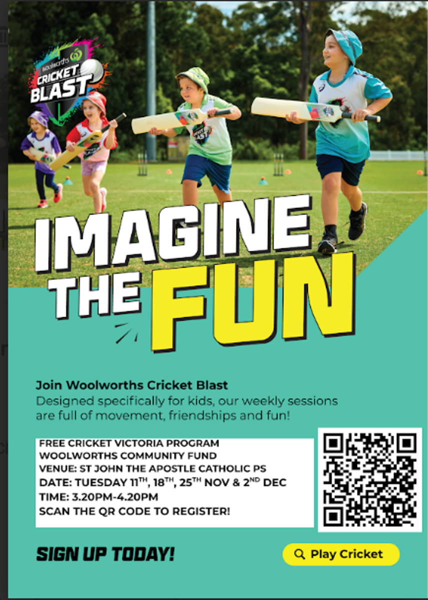 During Term 4 we will be running the “Woolworths Cricket Blast Program” from 3:20-4:20pm, on the St John the Apostle School Grounds. The program is free to all participants. These 1hour sessions will run over 4 Tuesdays and parents must collect their child at 4:20pm. The dates of the sessions are: