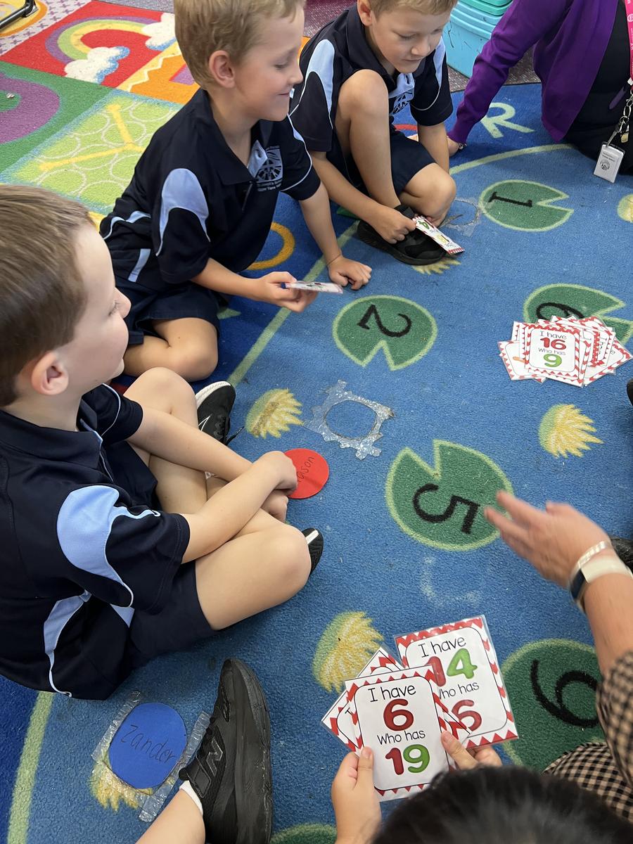 The Foundation students have been loving playing Maths games in Maths! Here is a game called 'I have, who has'. Students get a card and place the card in the middle, saying, for example, "I have 6, who has 19?" The person then puts 19 on top and asks who has the following number!