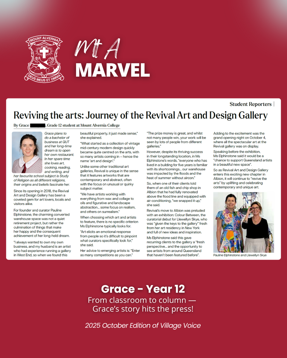 Congratulations to Year 12 student Grace, whose article was published in the October edition of The Village Voice! 👏 Grace worked under the mentorship of journalist Kate (@villagevoicebris) and showcased her impressive skills in interviewing, editing, and writing. A proud moment for this long-time member of our Writers Club!