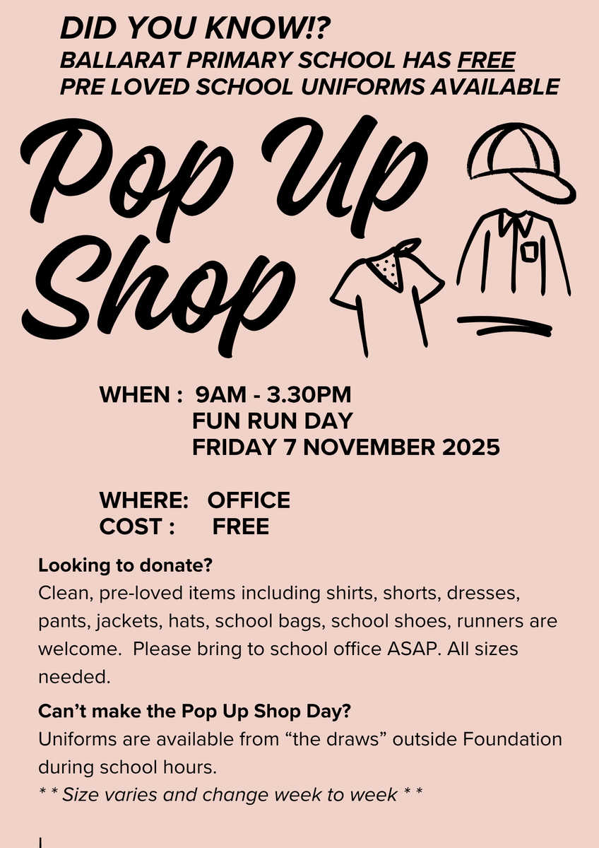 To make the Uniform Pop Up Shop as successful as possible, it would be helpful for donations of various sizing to dropped at school prior to Friday 7 November.