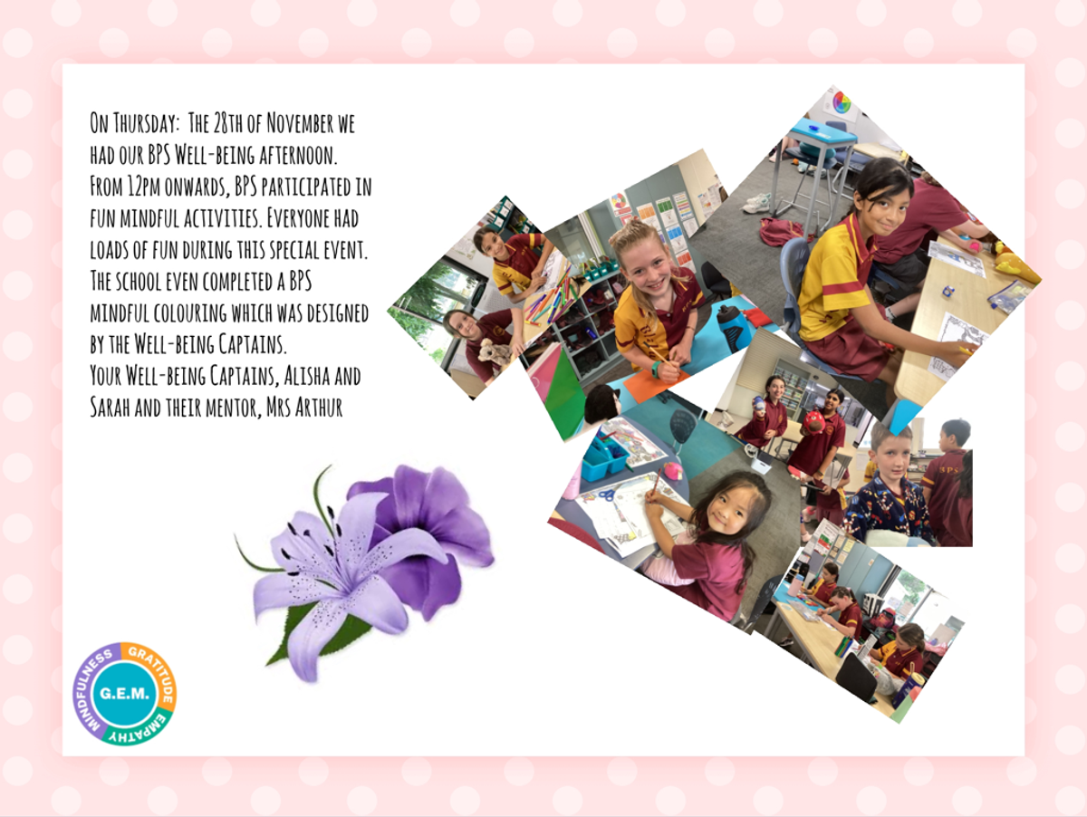 We wish you a happy and safe holiday with your families and hope that you continue practising these wellbeing strategies. Remember GEM (Gratitude, Empathy & Mindfulness). Thanks.