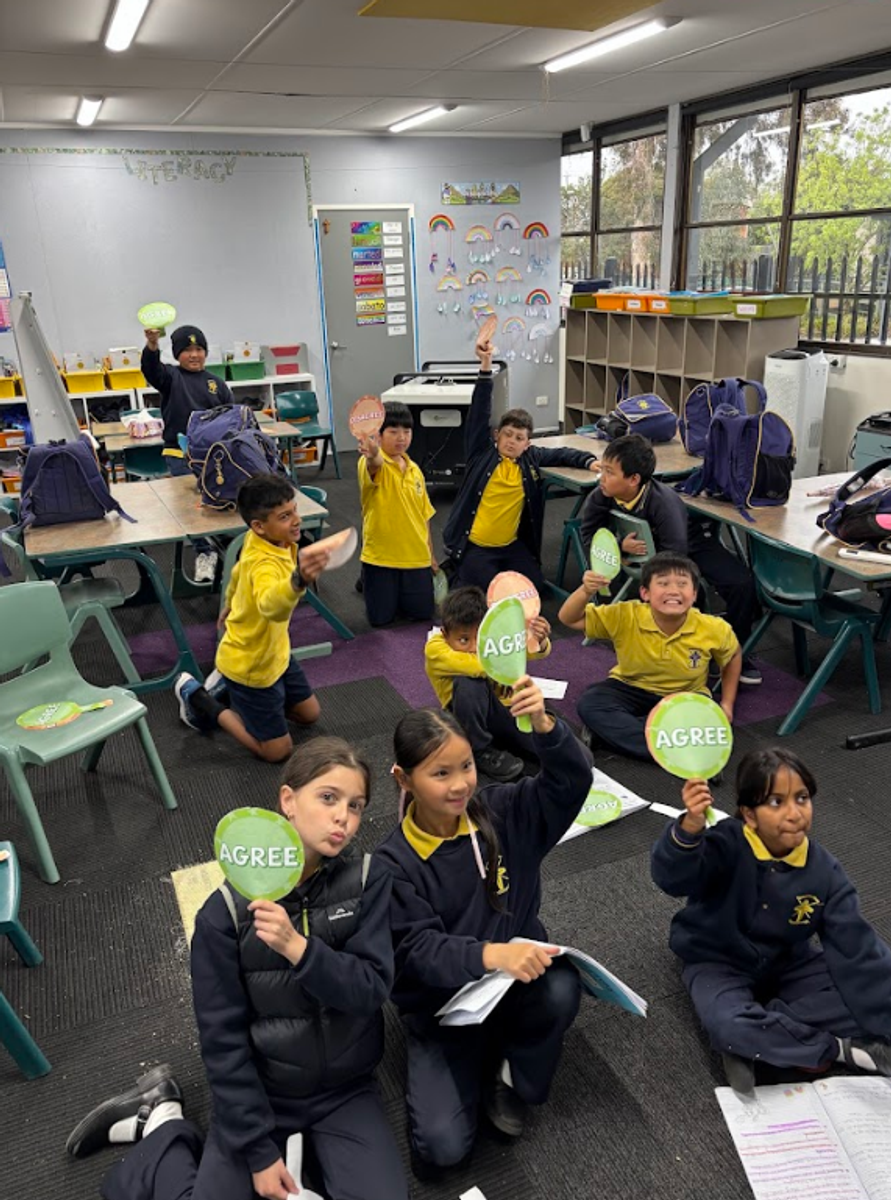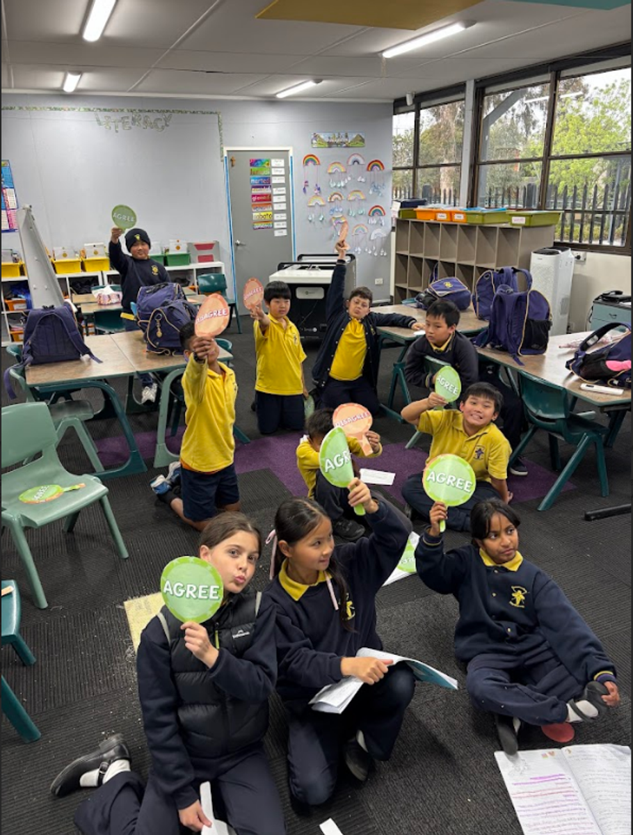 In writing, we have been learning about persuasive texts, about many different topics, such as you “Should You Have a Robot in Your Life” and “Banning Energy Drinks.” In a persuasive text, we have been learning that at the start, there's an introduction that introduces what you're talking about. The first body paragraph stays on one subject, and so do the other two. The conclusion wraps up what you’ve been writing about and says your reasons again. That is all for the Writing.