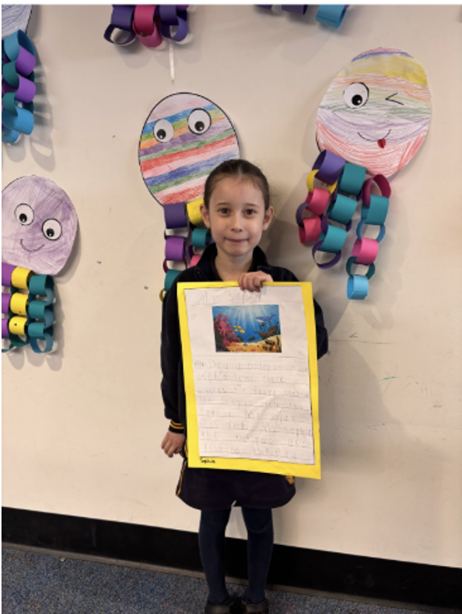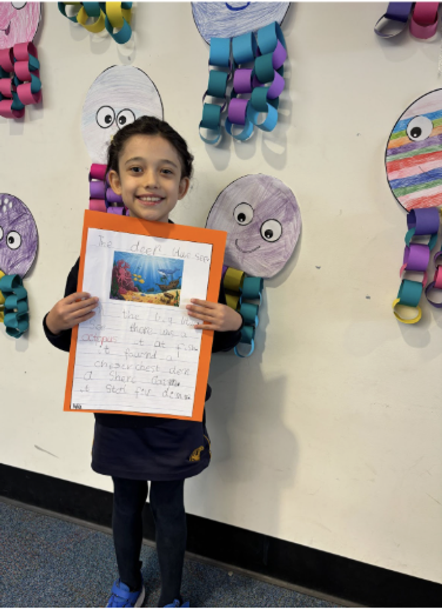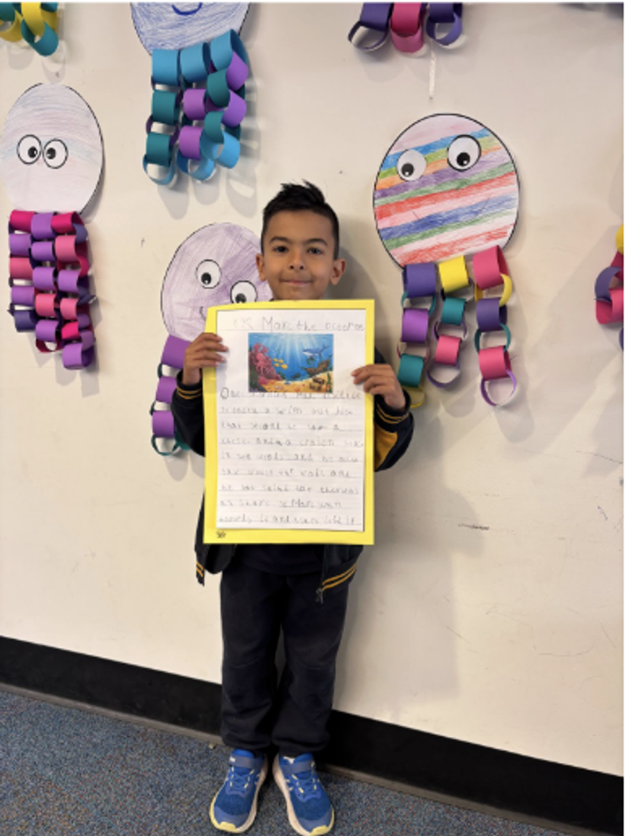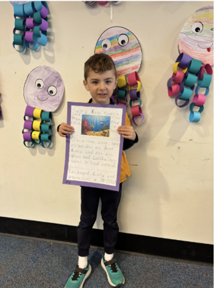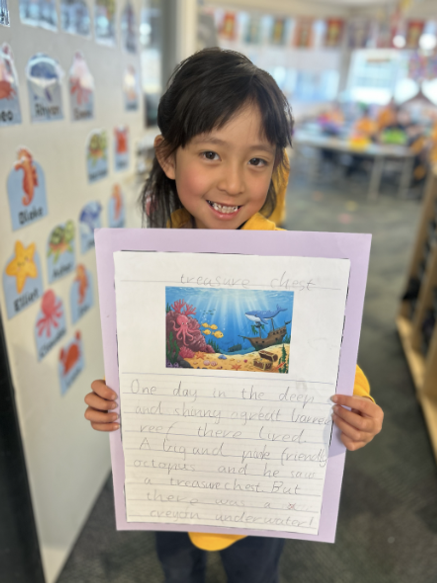 In our Rocket Writing sessions, we continued building super sentences and creating imaginative texts. Students let their imaginations run wild, writing about deep-sea adventures, colourful coral reefs, and fascinating sea creatures. Along the way, we focused on remembering to use capital letters, full stops, finger spaces, and correct punctuation to make sure our sentences were complete and polished.