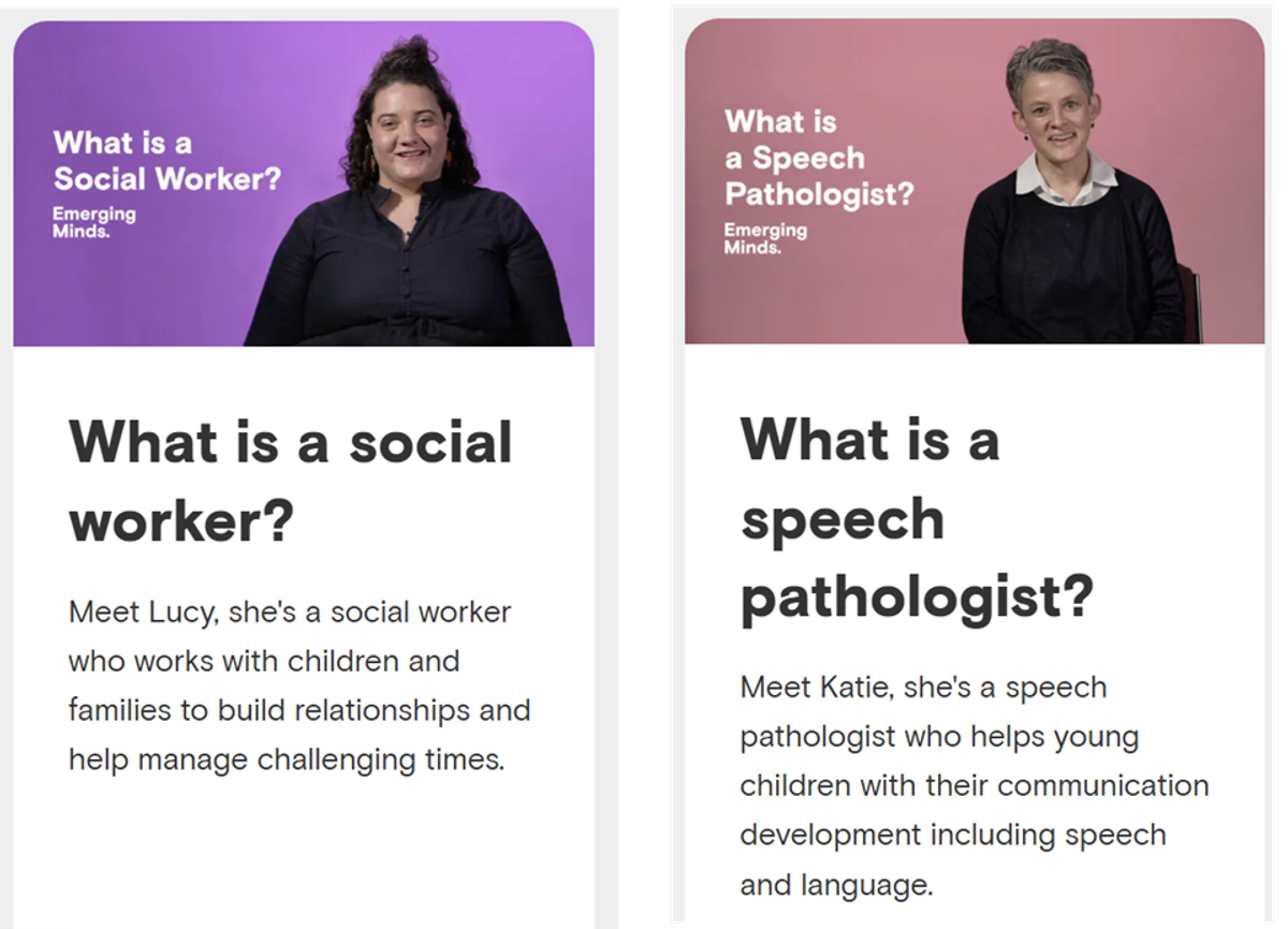Follow the link below to access the Emerging Minds website to hear from health professionals such as speech pathologists, counsellors, social workers, paediatricians, GP’s, occupational therapists (OT’s) and many more!