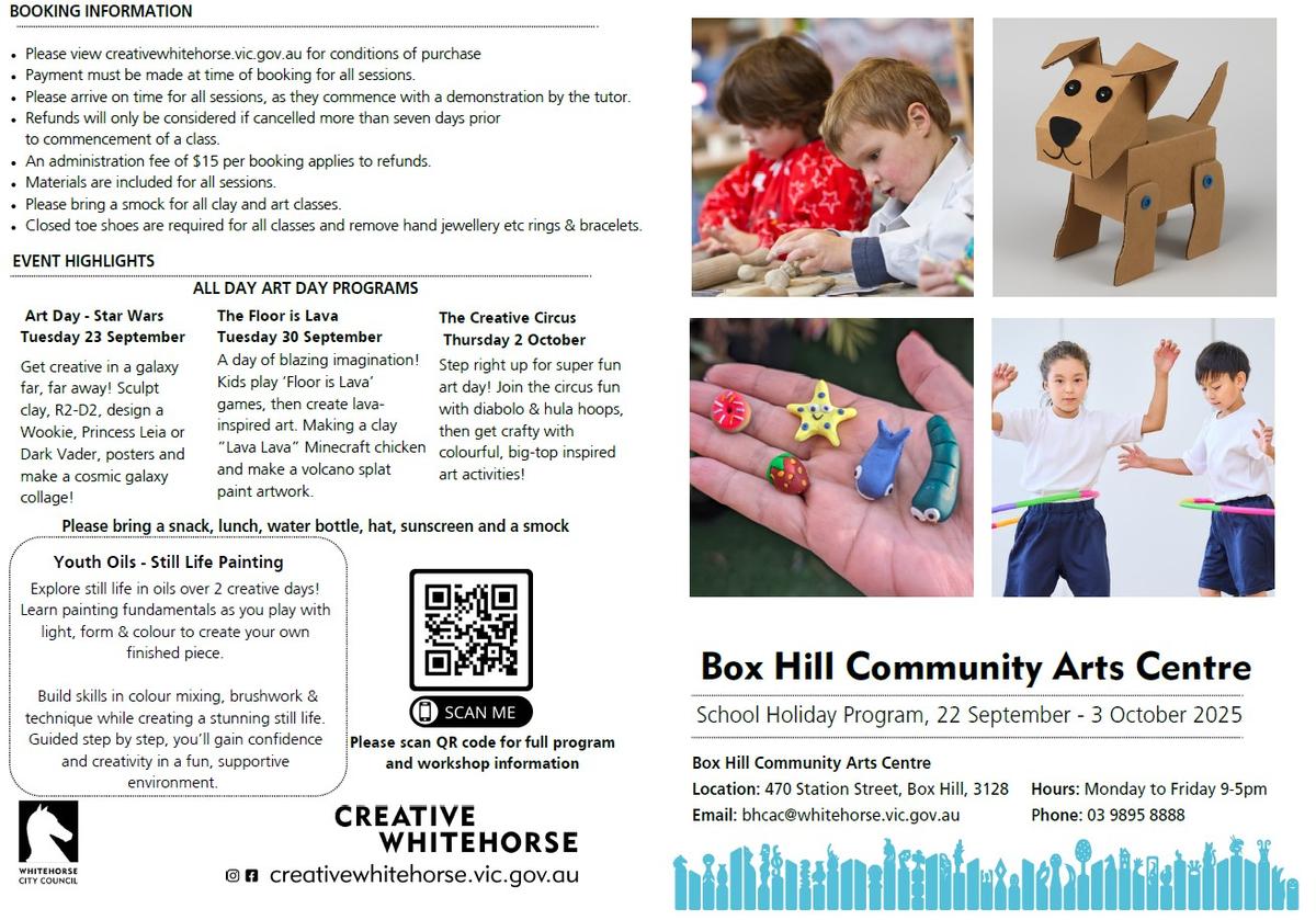 The Box Hill Community Arts Centre is excited to present our September School Holiday Program (22 September – 3 October 2025), offering a wide range of fun, creative and engaging workshops for children and young people in our local area.
