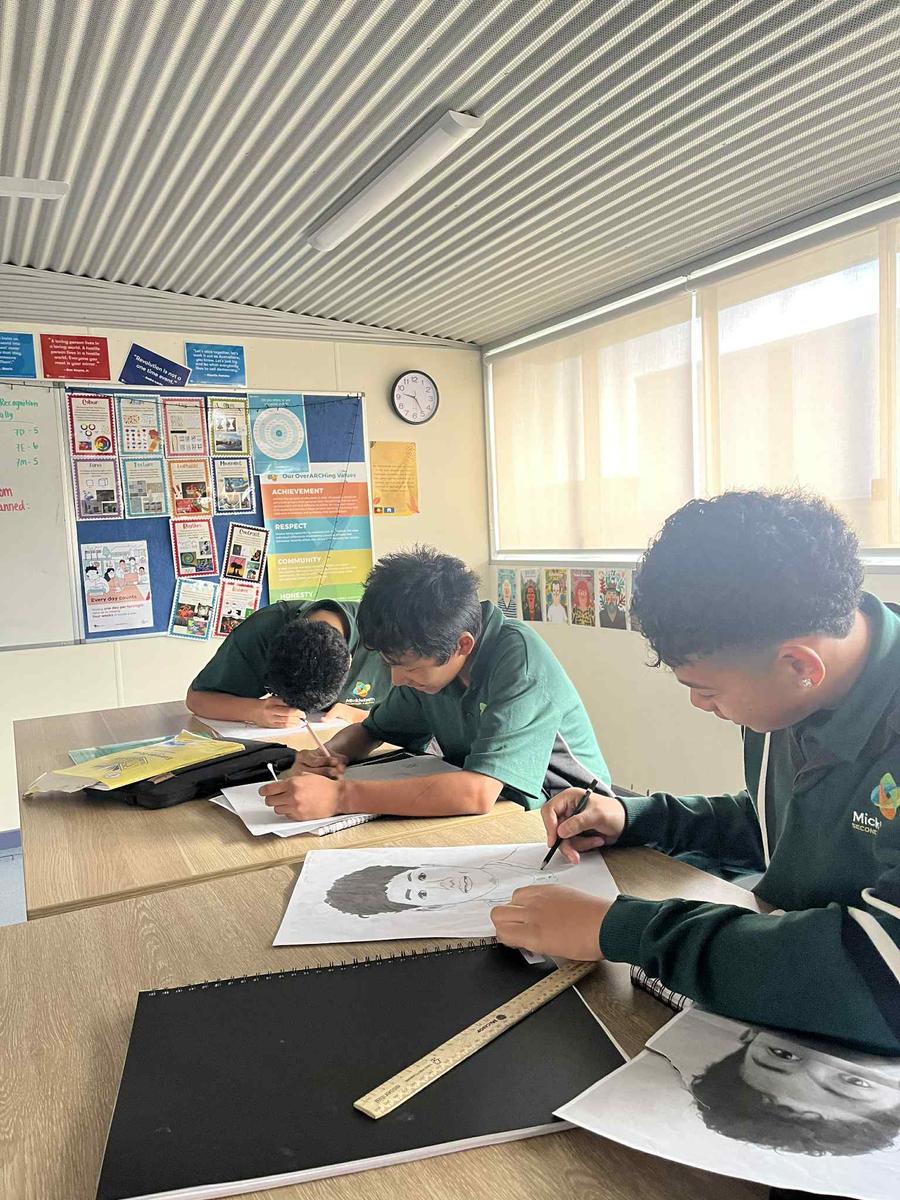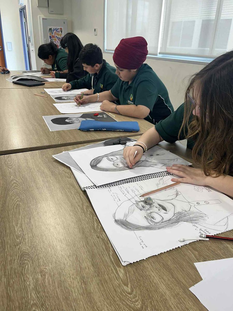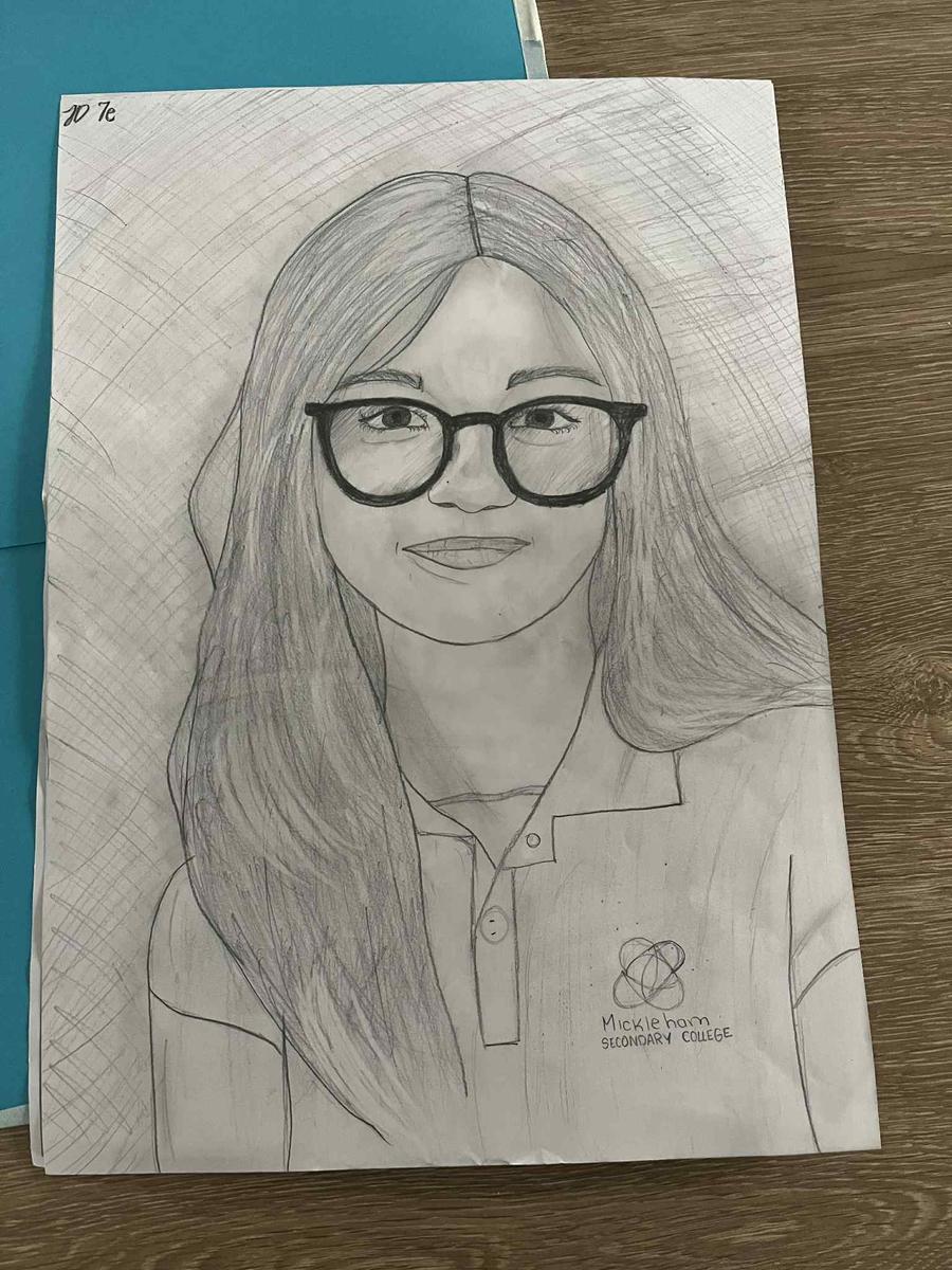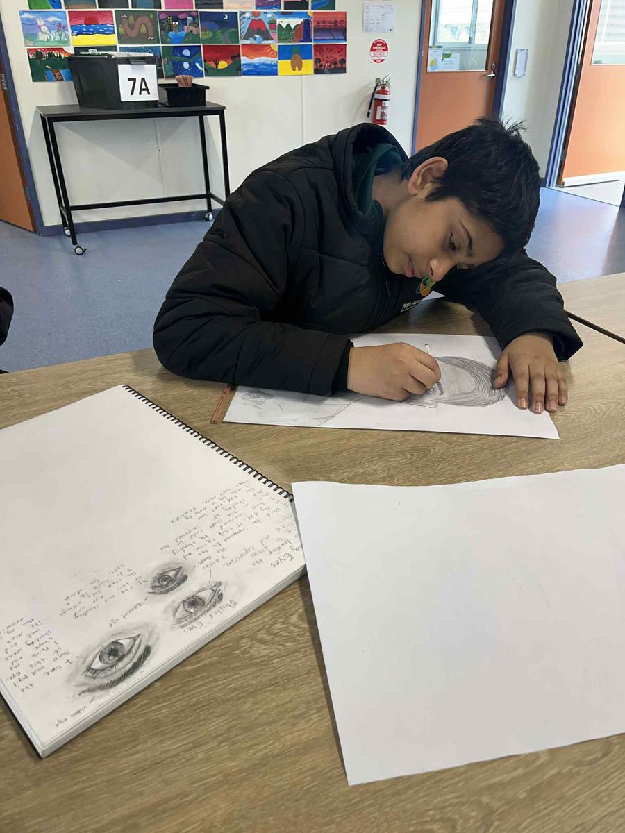 In Year Seven Visual Arts, students have learnt to draw facial features and apply shading techniques to create realistic drawings. They are now finalising their self-portrait using the skills and techniques developed throughout the term".