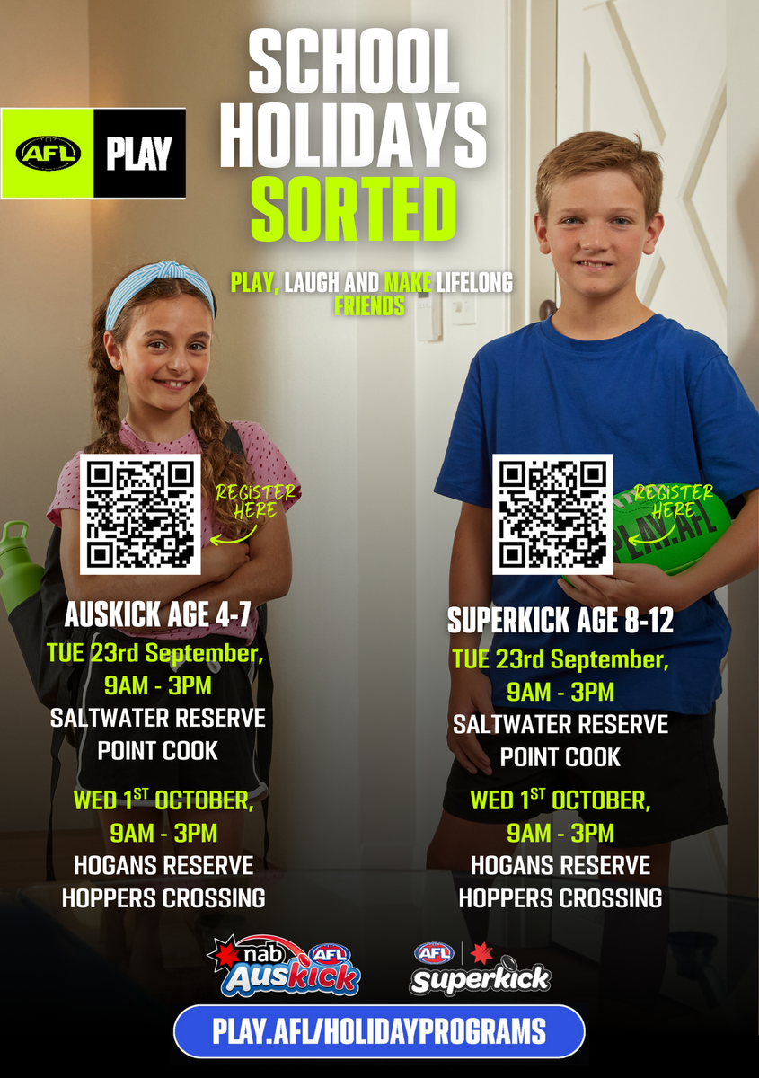 AFL Victoria is excited to announce the Auskick and Superkick programs starting on the 23rd of September at 9am - 3pm at Saltwater Reserve Point Cook & Hogans Reserve, Hoppers Crossing 9am - 3pm !