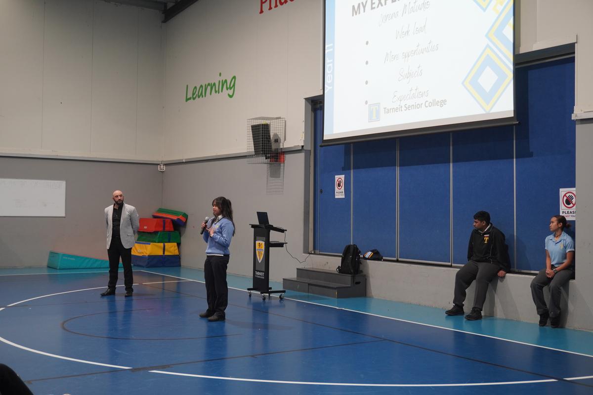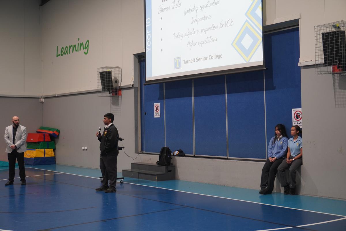 Standing in front of hundreds of students, Sharan, Xirena, and Misha spoke confidently about their experiences at Tarneit Senior College. They highlighted the wide range of opportunities available, from academic programs to extracurricular activities, helping the Year 9s understand what to expect in the coming years. Their messages were clear and encouraging: work hard, stay focused, and make smart choices to set yourself up for success.