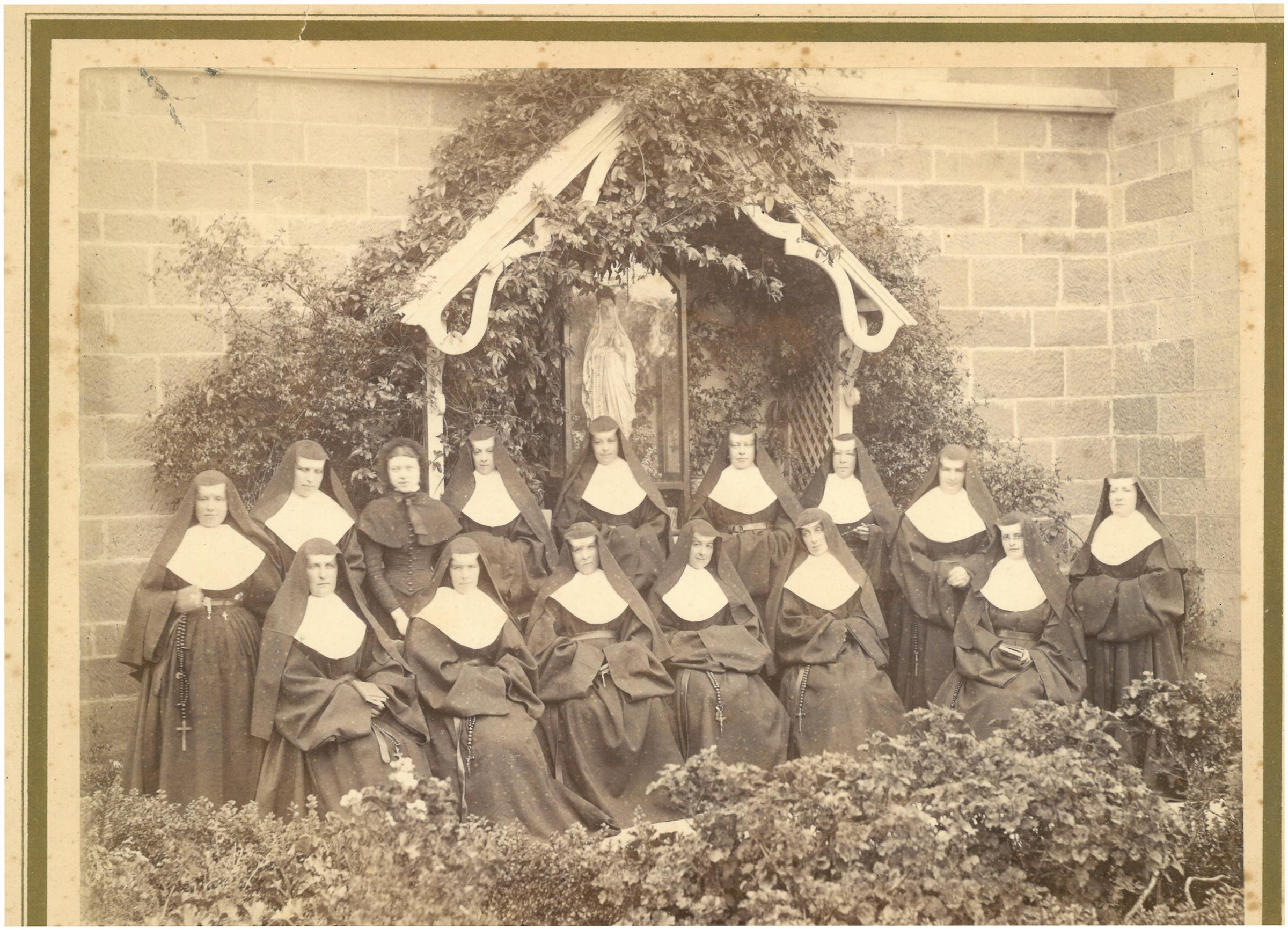 Mother Xavier died in 1880 and was buried close to the Cathedral. Her grave is marked by a white cross and placed within a lovely garden where the St Virgil's College Junior School playground now sits. If you look closely at the image, you'll notice there's no sign of the large sandstone extension added in 1888 or the parapet building. Back then, the land on the hill was used for raising various animals for food and growing vegetables.