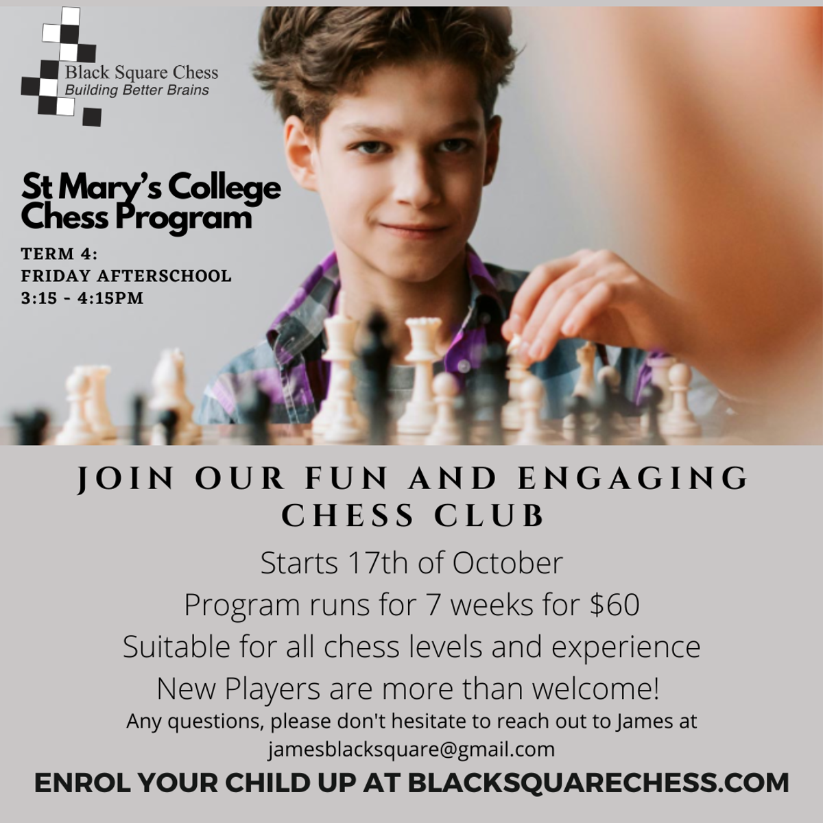 The club is open to all skill levels, and sign-ups are available online at https://blacksquarechess.com/