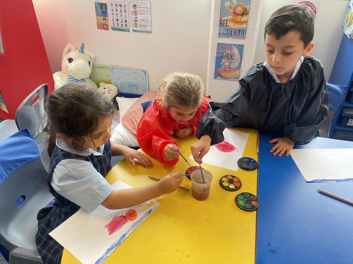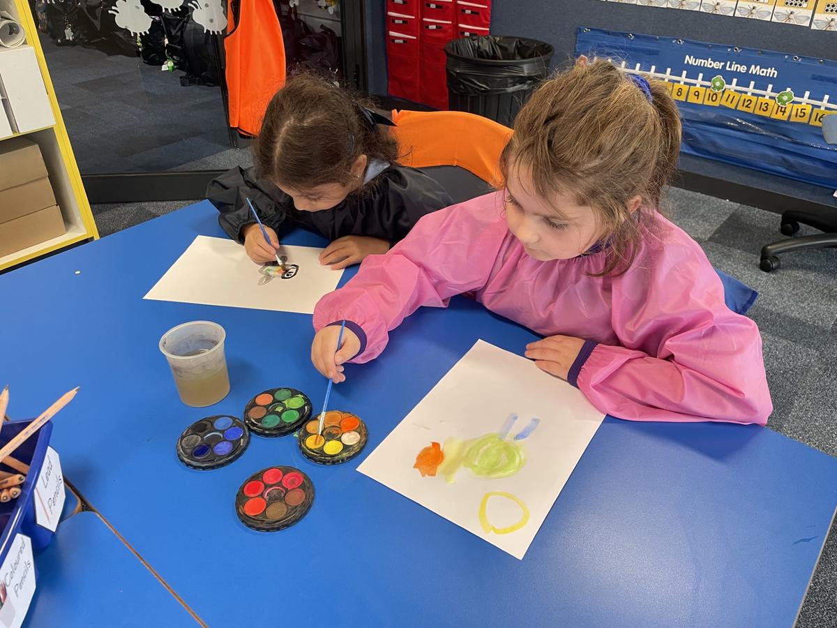 Kindergarten White is diving into a creative project inspired by their shared reading book! The students are using water coulor paints to bring a dragon to life, connecting their love for storytelling with artistic expression. As they paint, they are practicing fine motor skills and learning about colour blending and techniques.