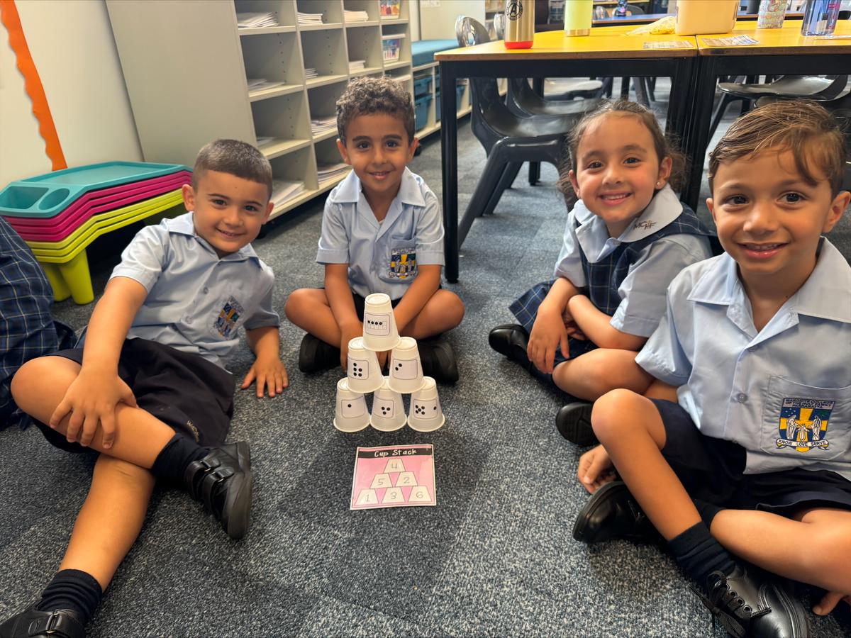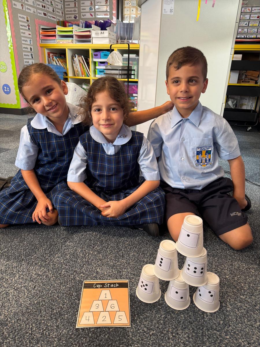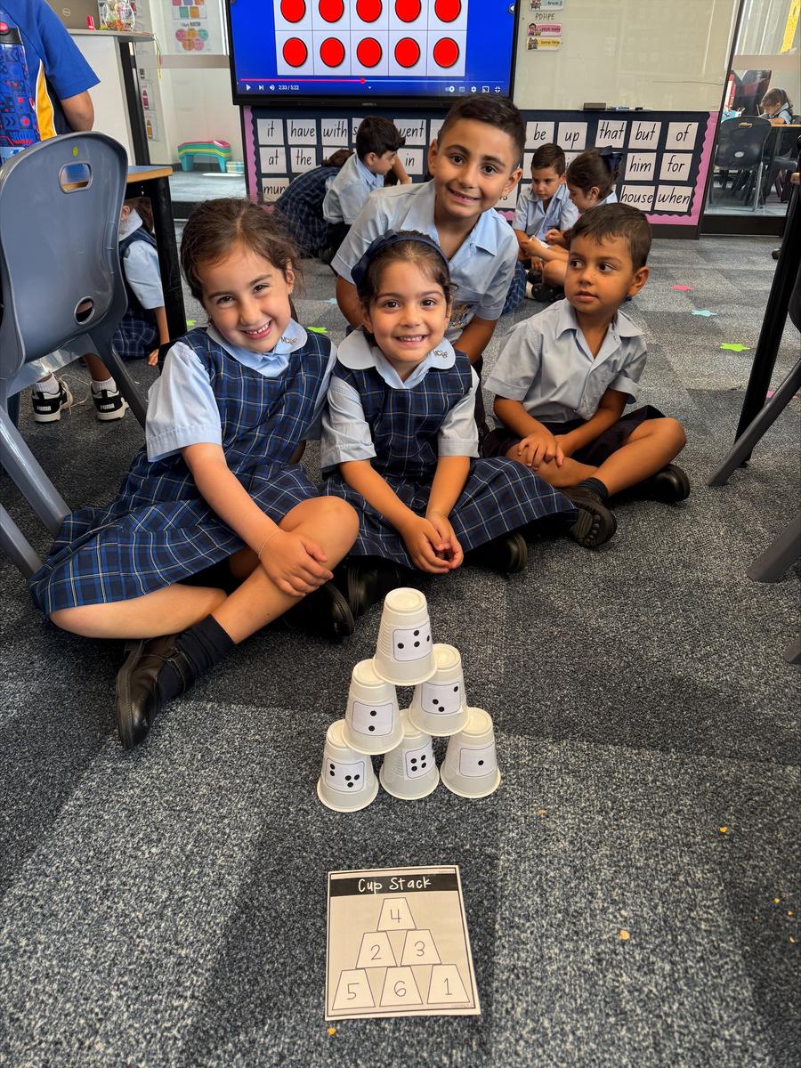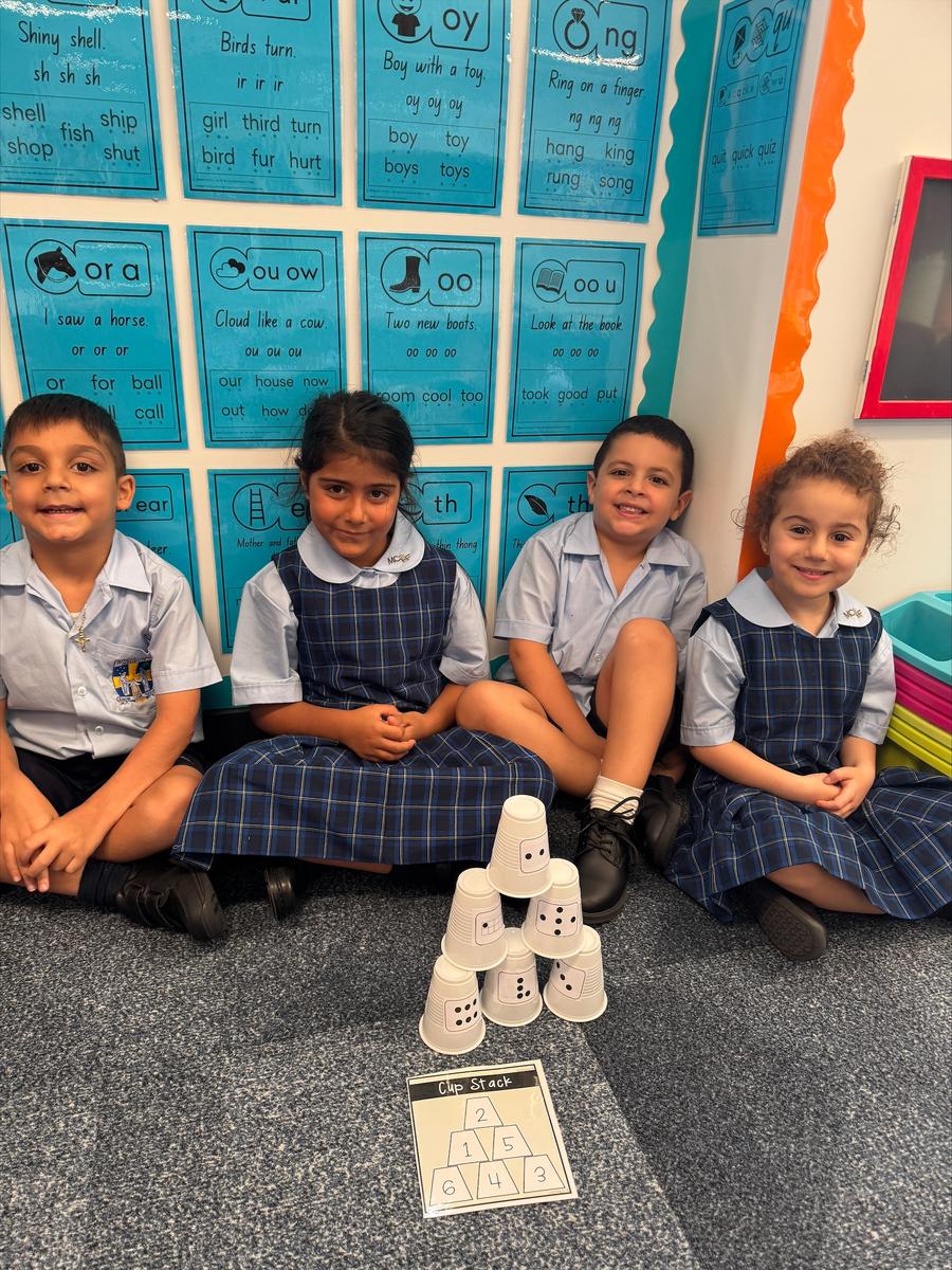 Kindergarten Red worked in small groups to practice subitising by identifying dot patterns and using them to create cup stacks.