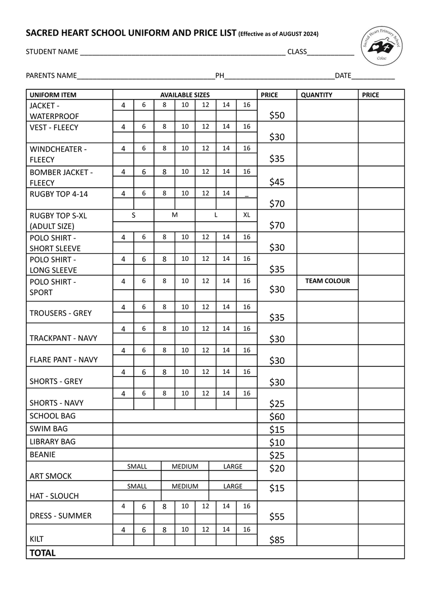 A reminder that if the uniform you purchase doesn’t fit, you are welcome to exchange,
