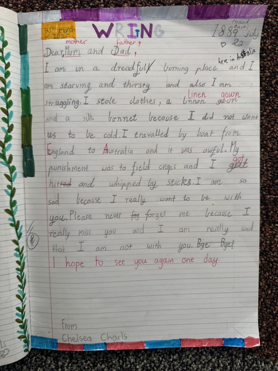 💌 Writing Letters as a First Fleet Convict – As part of our history studies, students have stepped into the shoes of a First Fleet convict, writing letters back home about their experiences. This has helped them develop empathy and a deeper understanding of Australia’s past while practising their formal letter-writing skills.