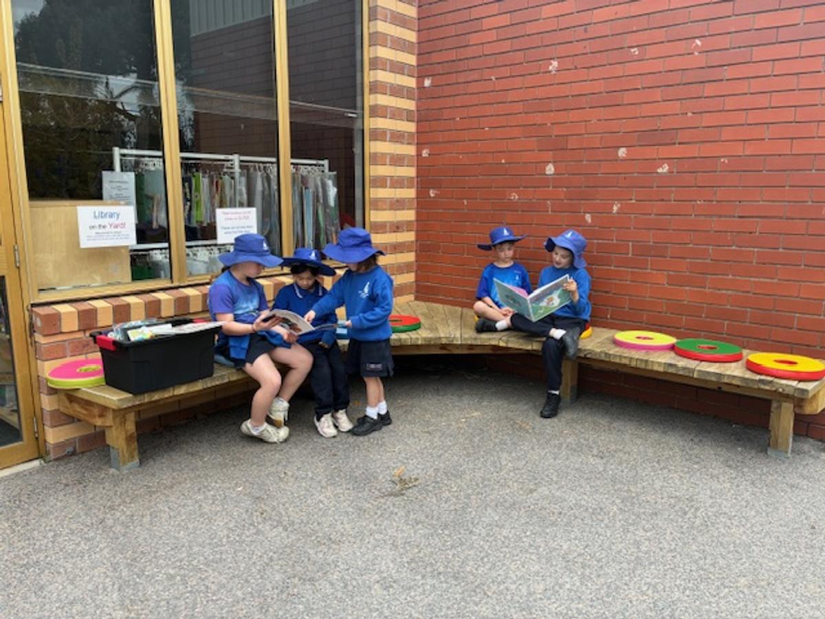 Now that the days are getting a little warmer, we thought we would bring the library outside. Every lunchtime our student librarians set up a comfortable space in the seating area in front of the library. Students can play chess, choose from a selection of books to enjoy, or bring along their own book to read.